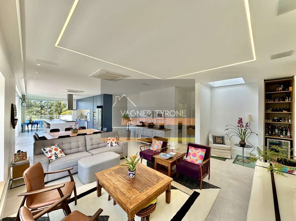 A área social é ampla, integrada e com iluminação projetada. O living para vários ambientes se conecta à cozinha gourmet equipada (Bertazzoni, Cuisinart, lava-louças, coifa inox, churrasqueira Evol e triturador InSinkErator).