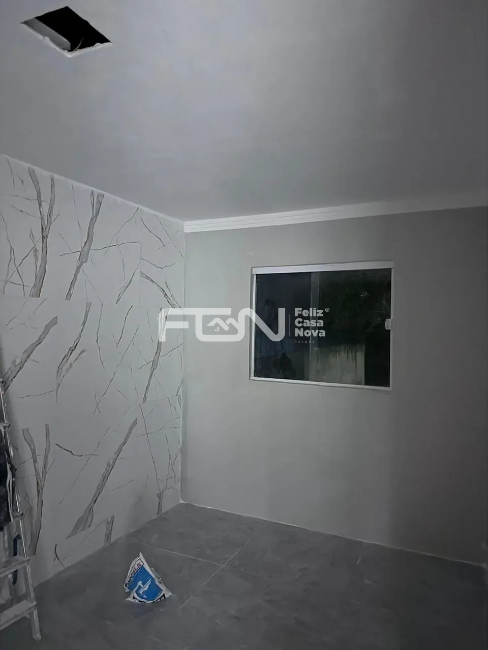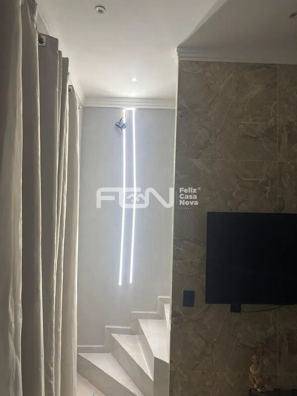 Sala com parede decorativa em efeito mármore