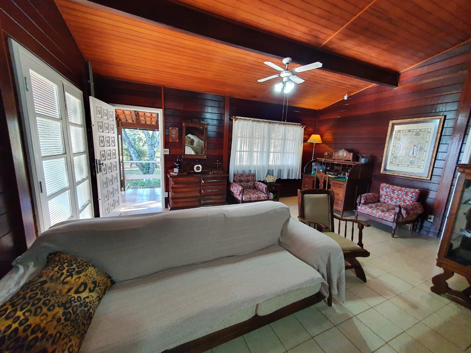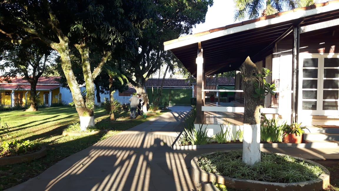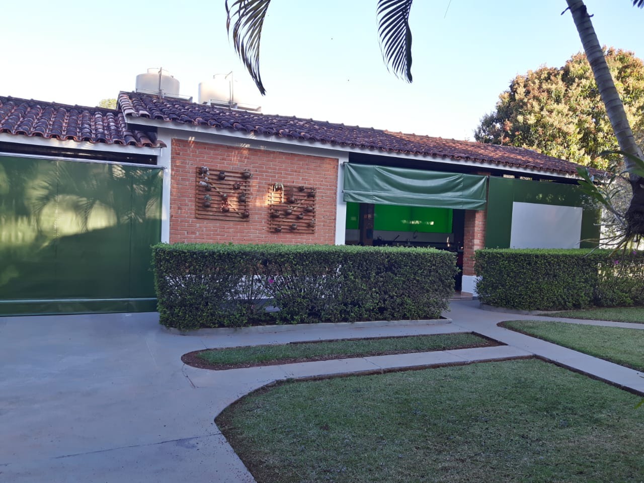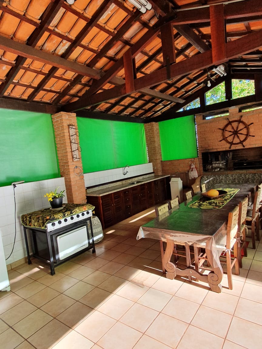Chácara com casa térrea: sala de estar ampla dois ambientes, 3 dormitórios sendo 1 suíte, cozinha, banheiro social, área de serviço, quintal amplo, pomar e horta, área gourmet com quarto de despejo e banheiro social, tendo nos fundos um quarto para ferramentas ou despejo, 2 garagens cobertas e 8 descobertas.