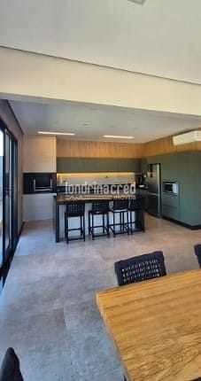 Sala de TV, lavabo, cozinha integrada e espaço gourmet com churrasqueira e ilha