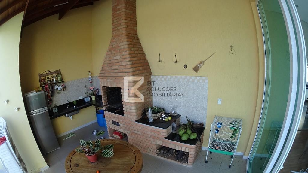 Área gourmet com churrasqueira conjugada, separada por porta de vidro, esquadria em PVC com altura de 3m