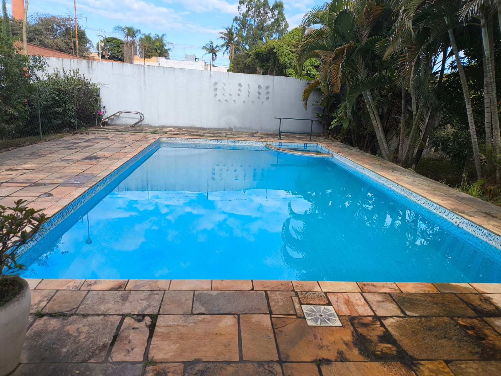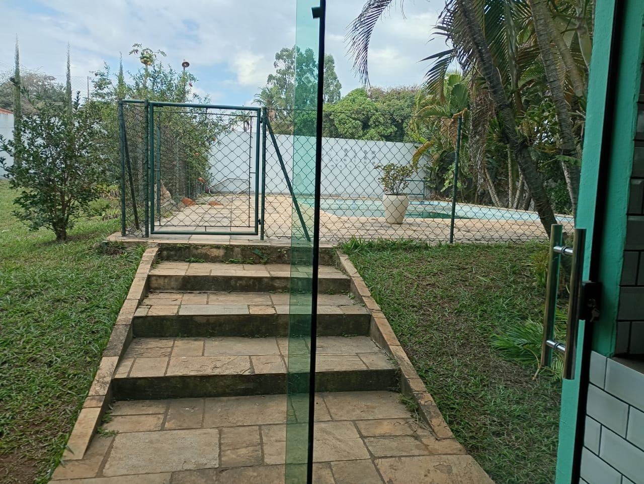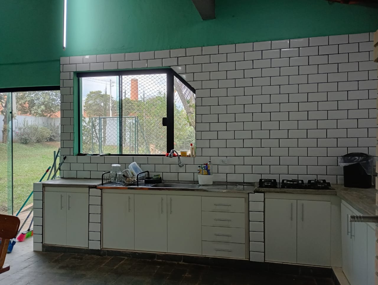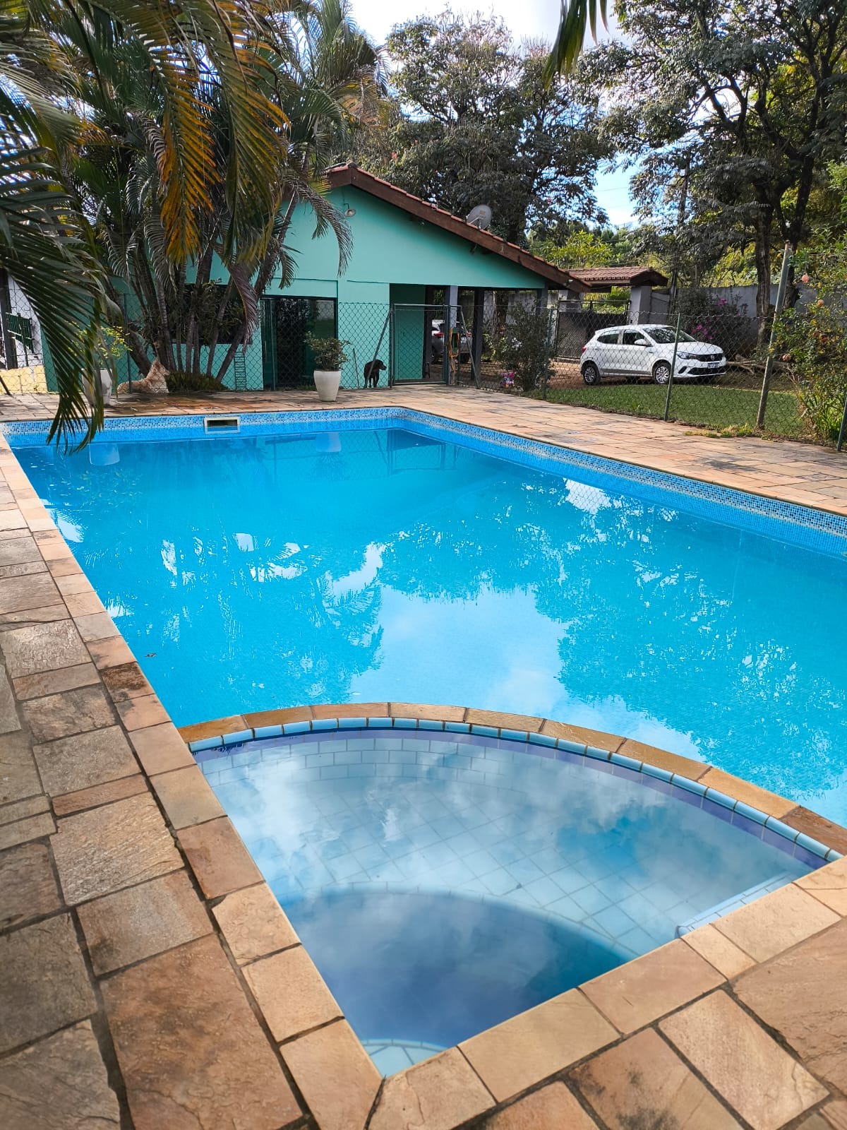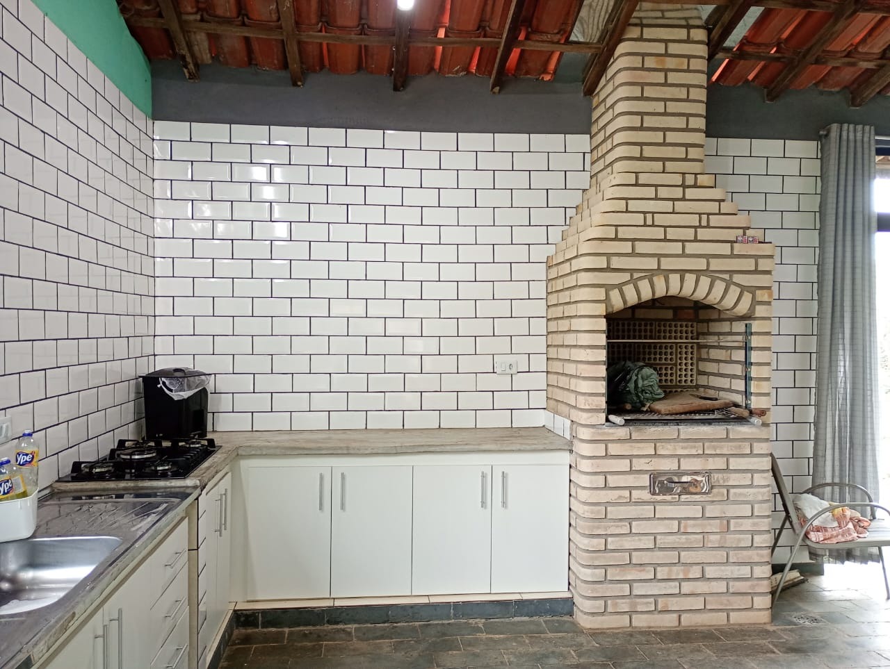 Área gourmet com churrasqueira armareos com pia e cooktop e banheiro. piscina toda cercada.