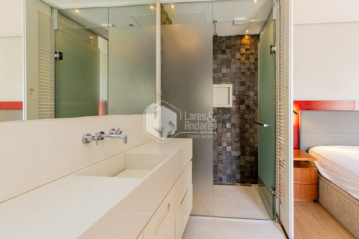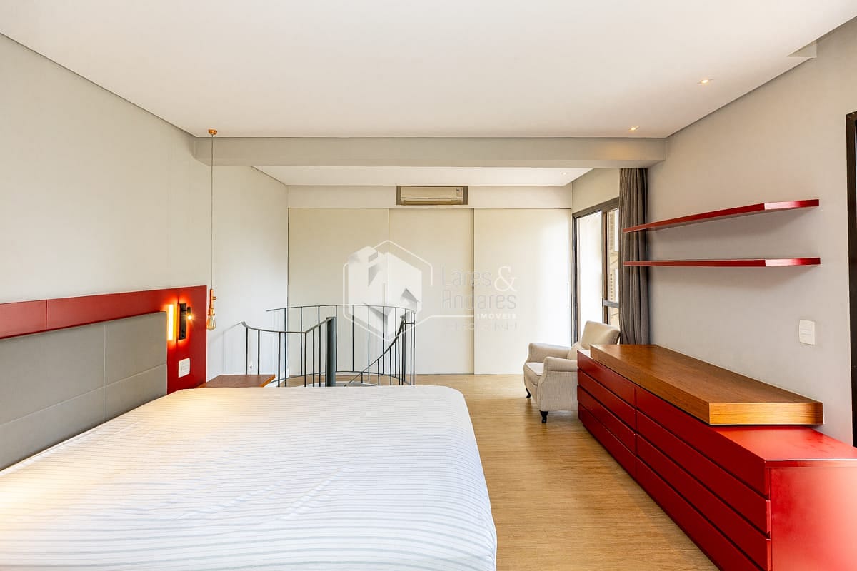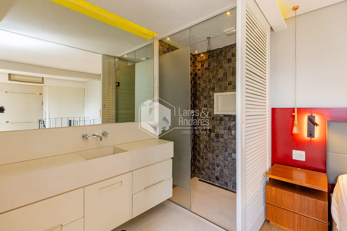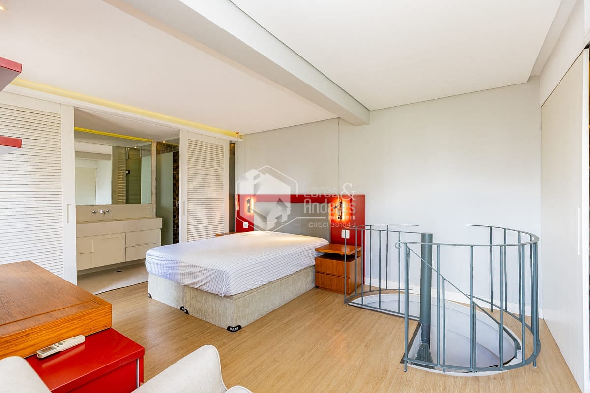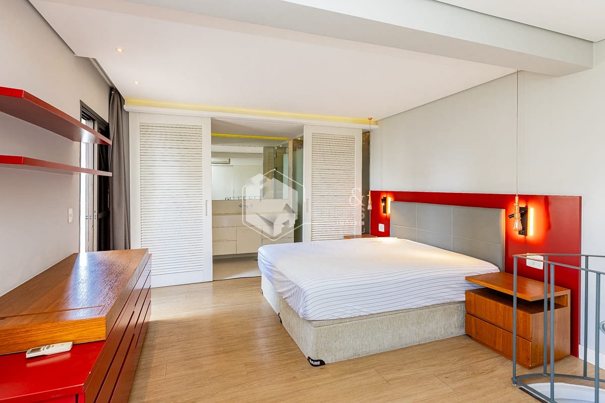 Conta ainda com excelente capacidade de armazenamento, com armários planejados no quarto, criados-mudos e banheiro, além de uma ampla cômoda, garantindo praticidade e organização.