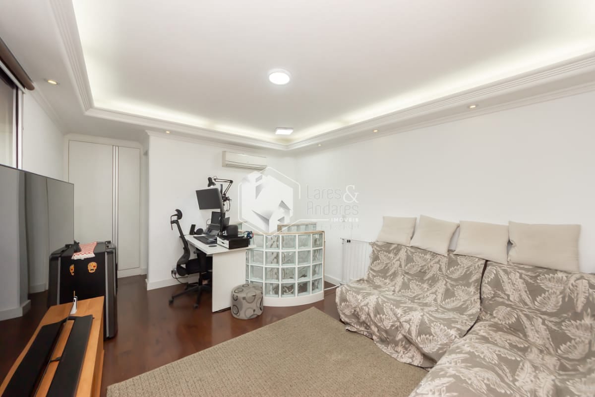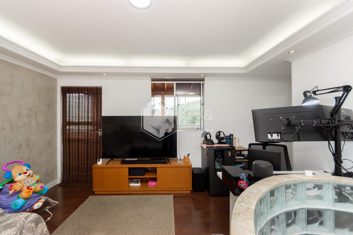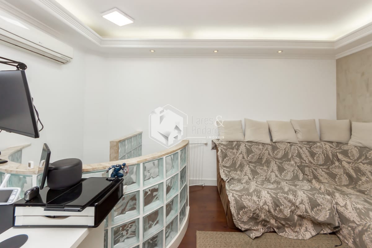 Na parte superior, a cobertura é um verdadeiro diferencial, área externa com churrasqueira privativa, envidraçada, com tela de proteção, conta com mais uma sala, escritório, banheiro e lavanderia, espaço para receber amigos e até um cantinho para pet, tudo isso com uma vista aberta e encantadora.