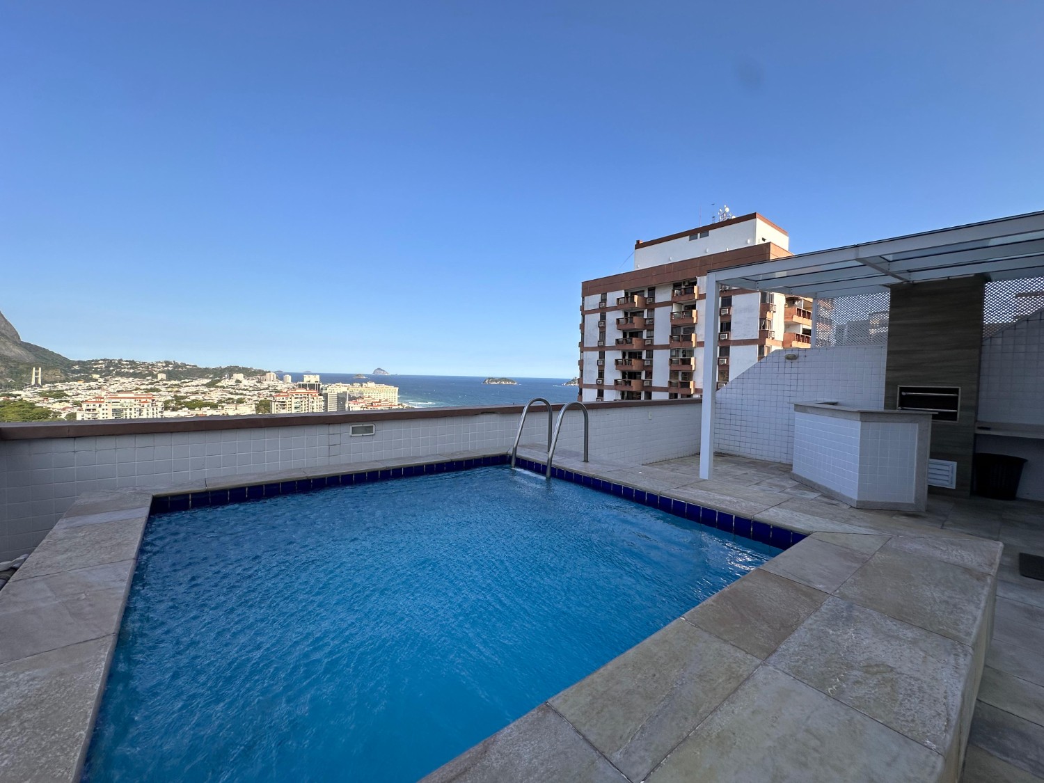 Segundo pavimento: saleta, suíte, amplo terraço com piscina, churrasqueira e com vista indevassável para o mar e para a Pedra da Gávea.