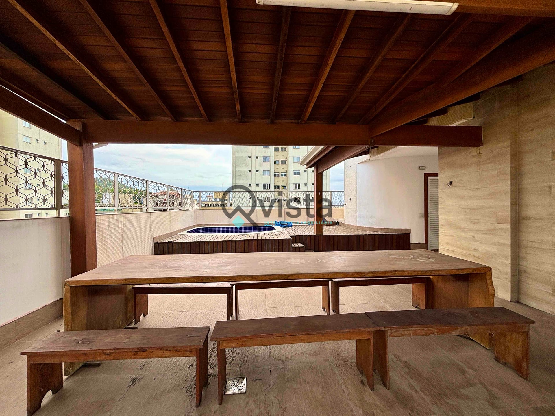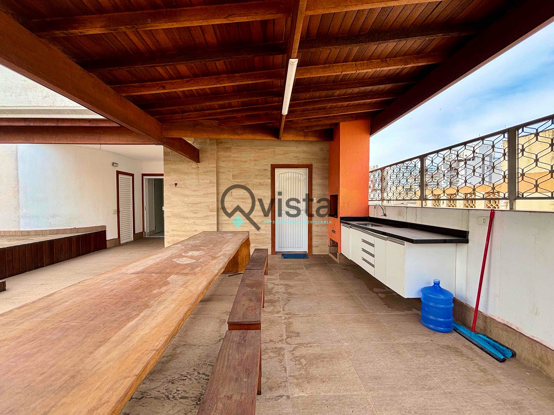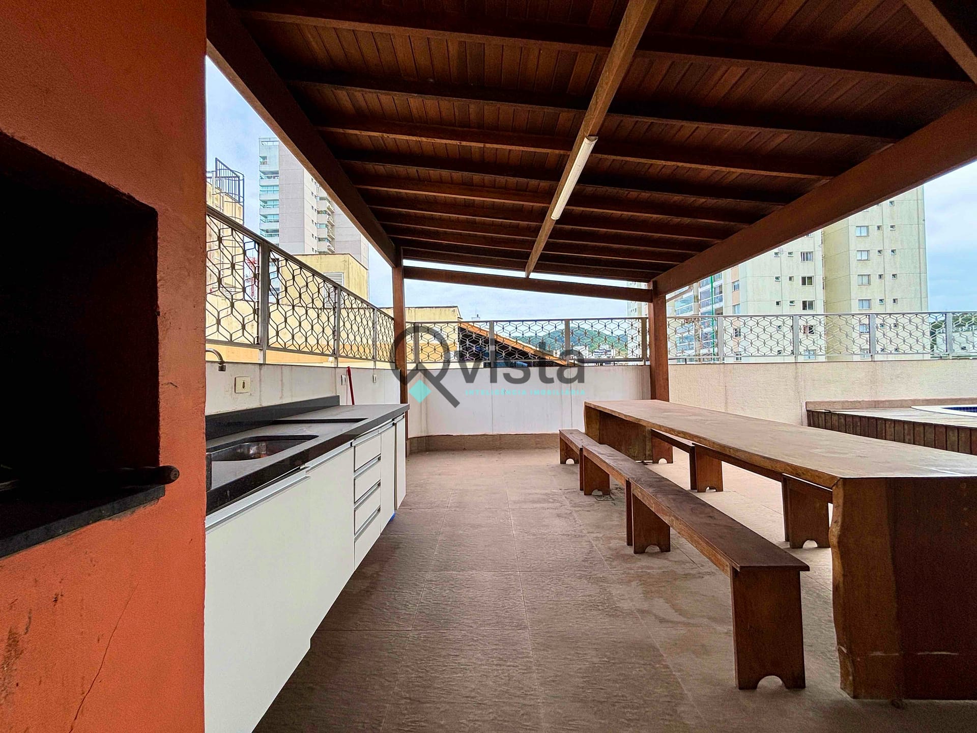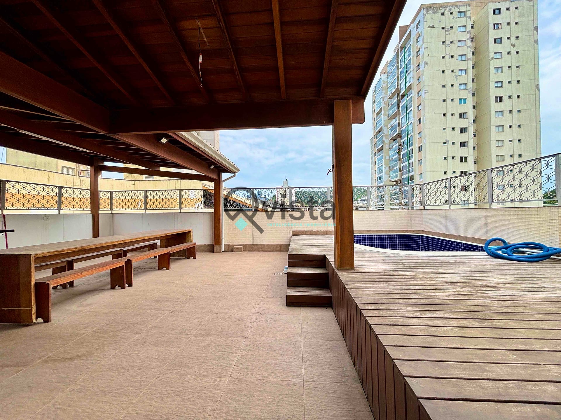 Área externa com piscina e área gourmet com churrasqueira;