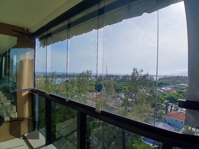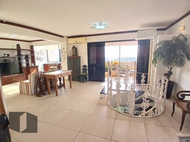 (Código: 12966, Rua Ataulpho Coutinho) - Mandala. Condomínio tradicional, muito bem localizado, junto aos melhores shoppings e colégios com total infraestrutura, segurança 24h, ônibus para Diversos pontos do Rio, balsa para praia e clube exclusivo. Excelente cobertura duplex, com linda vista para o mar e lagoa, no primeiro piso, hall de entrada, ampla sala em dois ambientes voltada para a agradável varanda com cortina de vidro e linda vista, um lavabo, banheiro social, circulação que leva aos três quartos, sendo uma suíte, todas com armários, cozinha e copa reformada e planejada(possibilidade de conceito aberto), área de serviço e dependência completa. No segundo pavimento com acesso por escada e elevador(privativo), uma ampla sala três ambientes, com banheiro, totalmente voltada para o terraço e vista livre, panorâmica, piscina, espaço gourmet e churrasqueira. Três vagas na garagem.