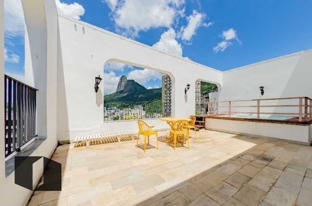 (Código: 61627, Rua Guilhermina Guinle) - Botafogo. Excelente cobertura em uma das ruas mais nobres. Edifício imponente, em centro de terreno. Imóvel duplex contendo no primeiro piso: sala em dois ambientes (janelas com sacada), 2 qtos (originalmente 3) sendo 1 suíte, banheiro social e copa cozinha com banheiro de serviço (quarto de serviço revertido). Segundo piso com ampla sala íntima, 1 suíte e amplo terraço com deck e piscina. Vista panorâmica eterna, indevassável, para o Cristo e a Zona Sul. Sol da tarde para melhor aproveitamento do terraço e da piscina.