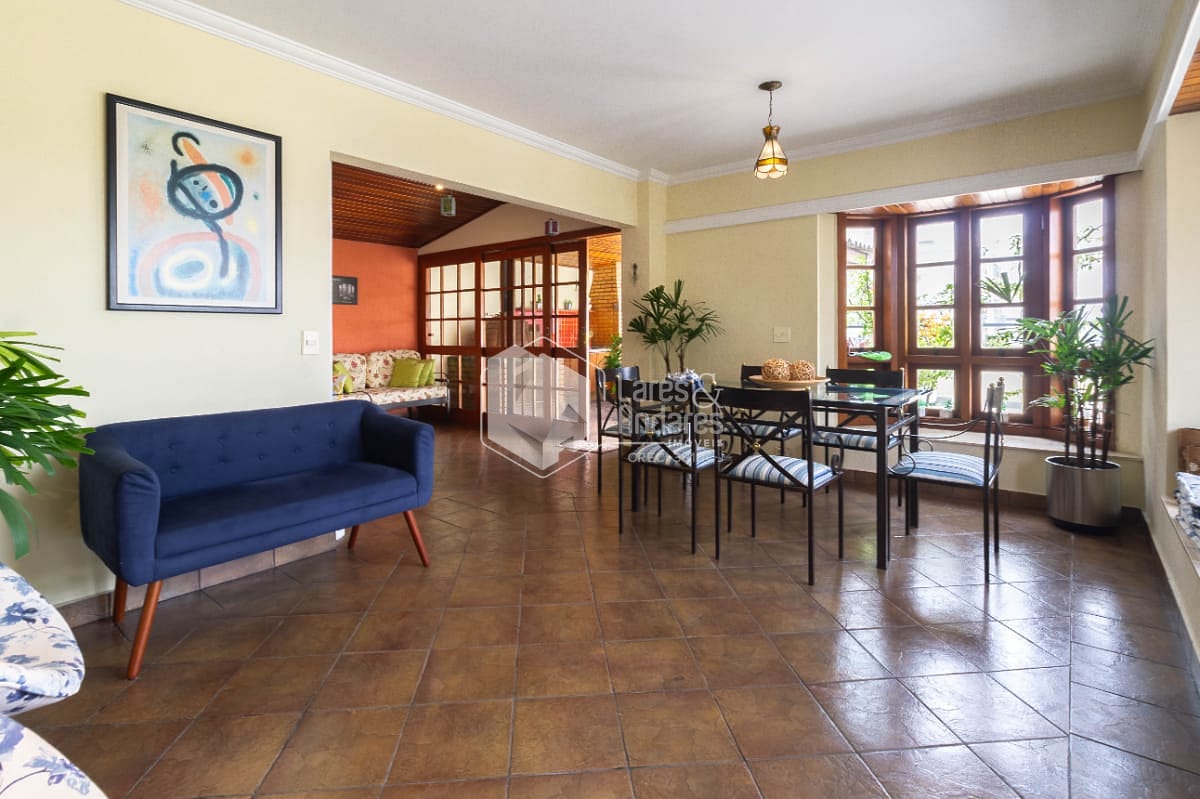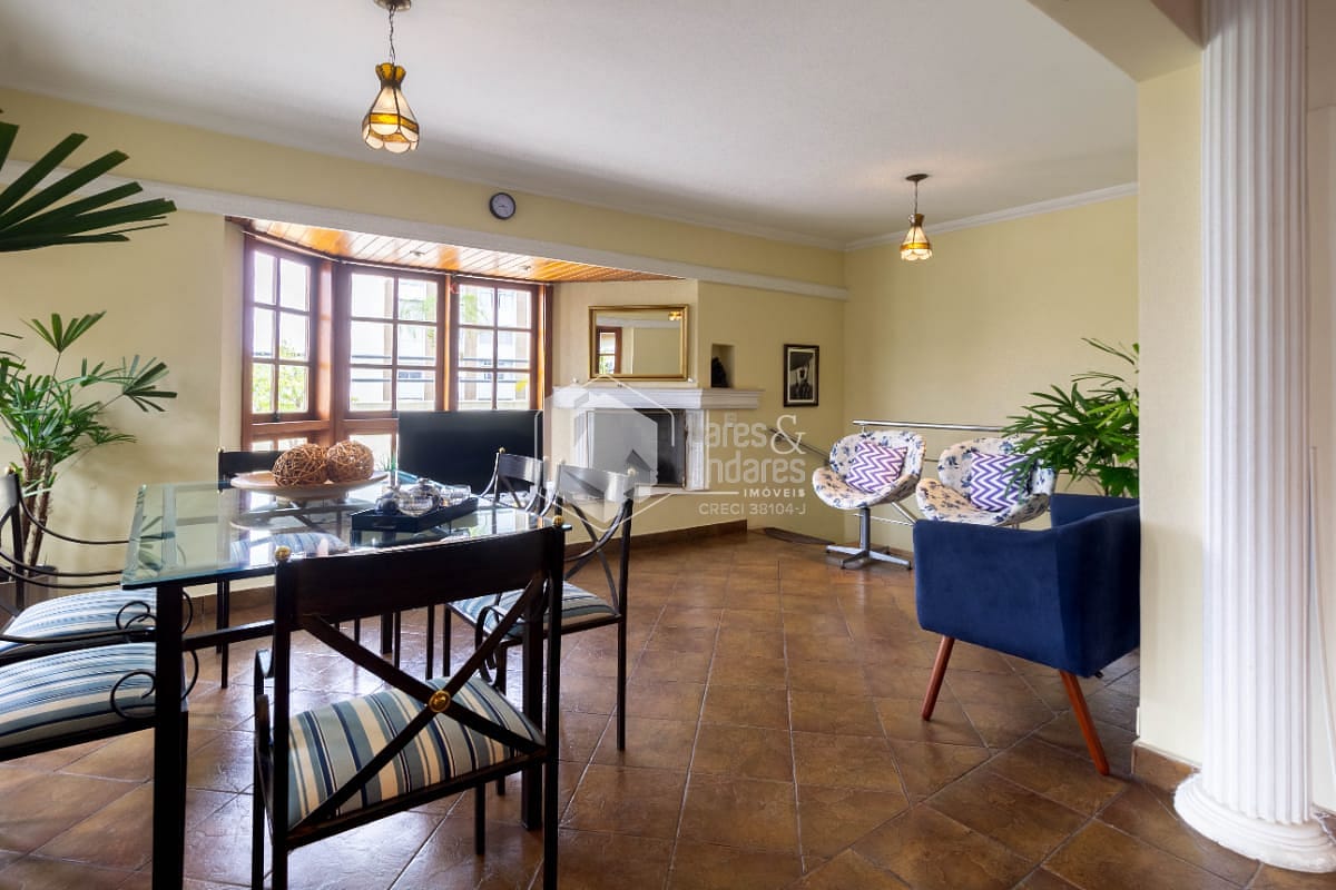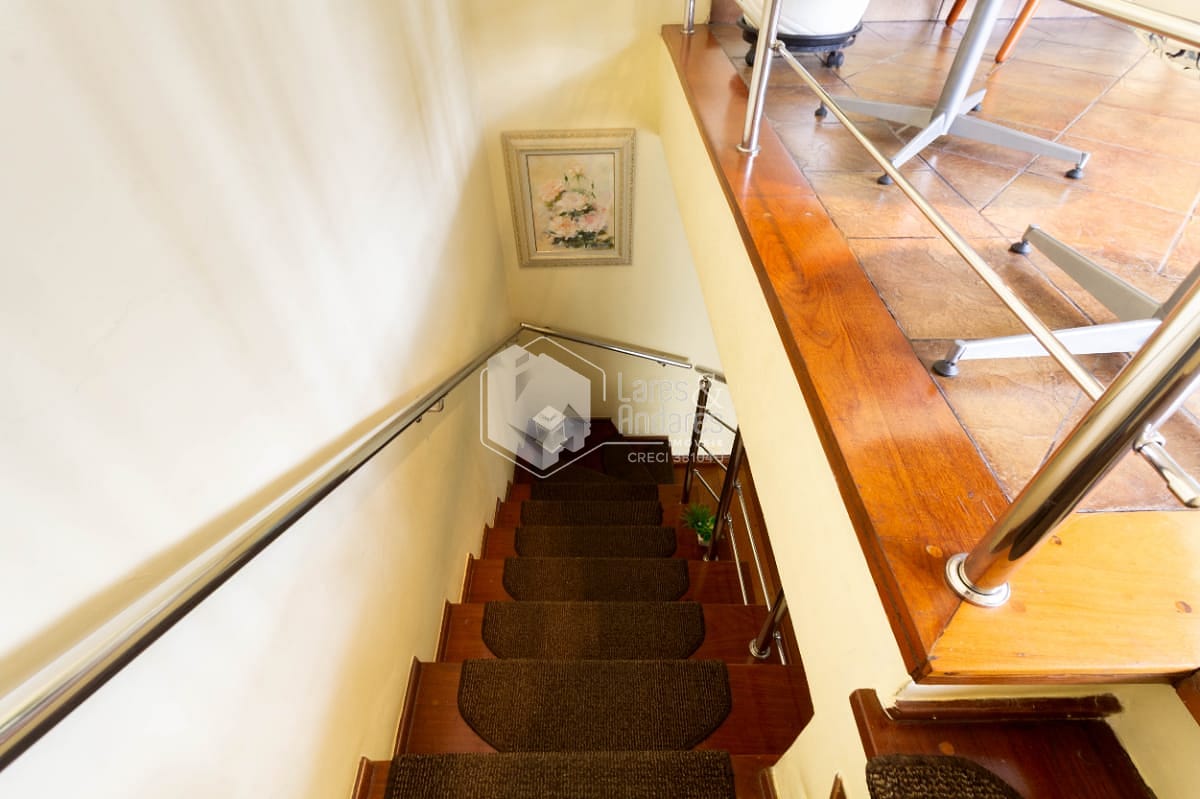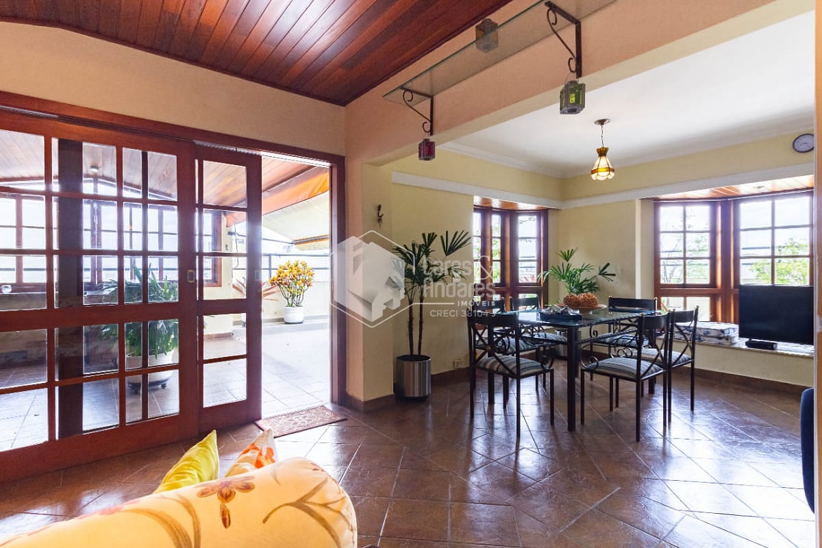 Subindo uma escada reta e confortável, chegamos na cereja do bolo! Uma sala muito aconchegante com lareira. Um terraço de aproximadamente 30m² com uma parte coberta. Nessa parte coberta, há churrasqueira e forno a lenha. O melhor lugar da casa para reunir a família e amigos além de garantir o espaço de lazer pro seu animal de estimação.