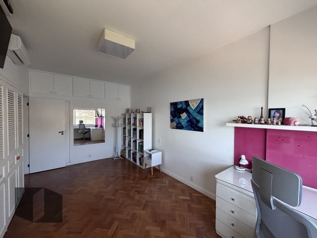 No 2º piso, varanda frontal com vista para a Lagoa (45 m²), ampla sala de estar e de TV. Varanda de fundos com piscina e churrasqueira com vista para o Cristo, além de uma suíte com closet e banheiro social com sauna. O piso superior ainda possui cozinha planejada e área de serviço independentes do piso inferior.
