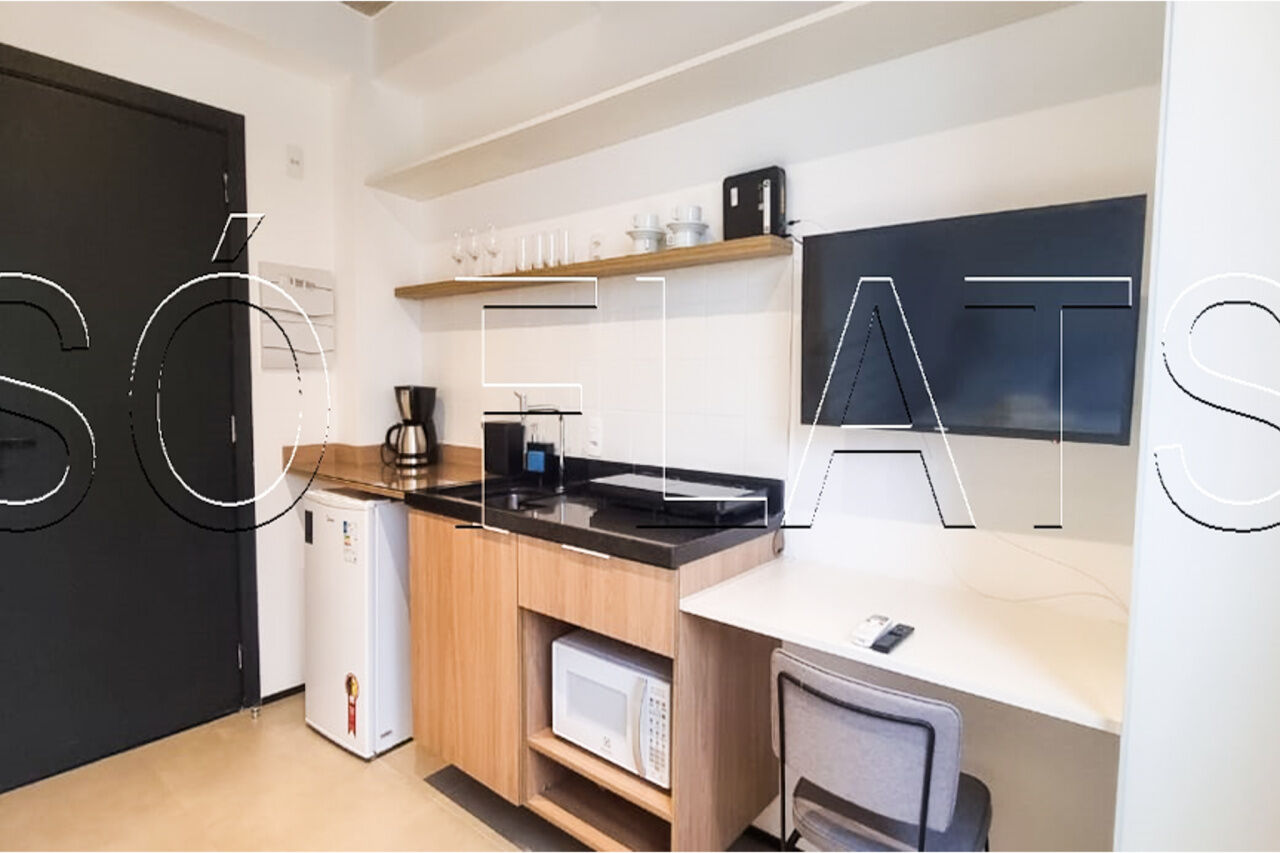Studio mobiliado de 17m² muito bem distribuídos, com ar-condicionado, armários planejados e cozinha americana equipada. Pronto para morar ou começar a rentabilizar imediatamente.
