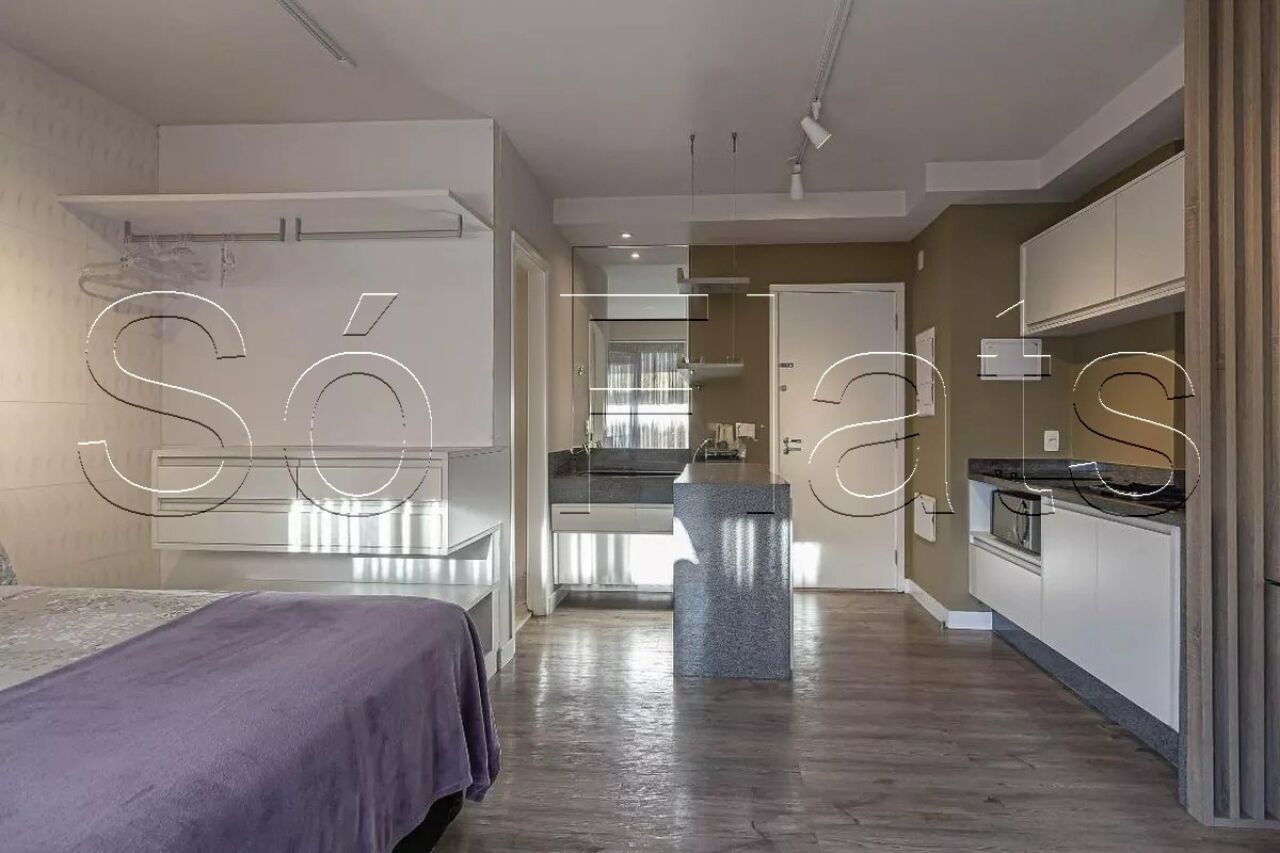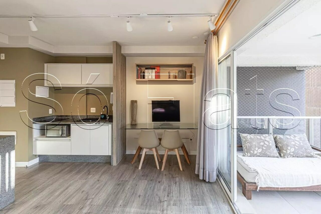 O apartamento disponível segue o modelo studio, moderno, mobiliado e totalmente equipado, com 35m² muito bem distribuídos em um dormitório integrado, cozinha americana funcional, uma linda varanda fechada com vidro que amplia a sensação de espaço e iluminação natural, além de contar com uma vaga de garagem.