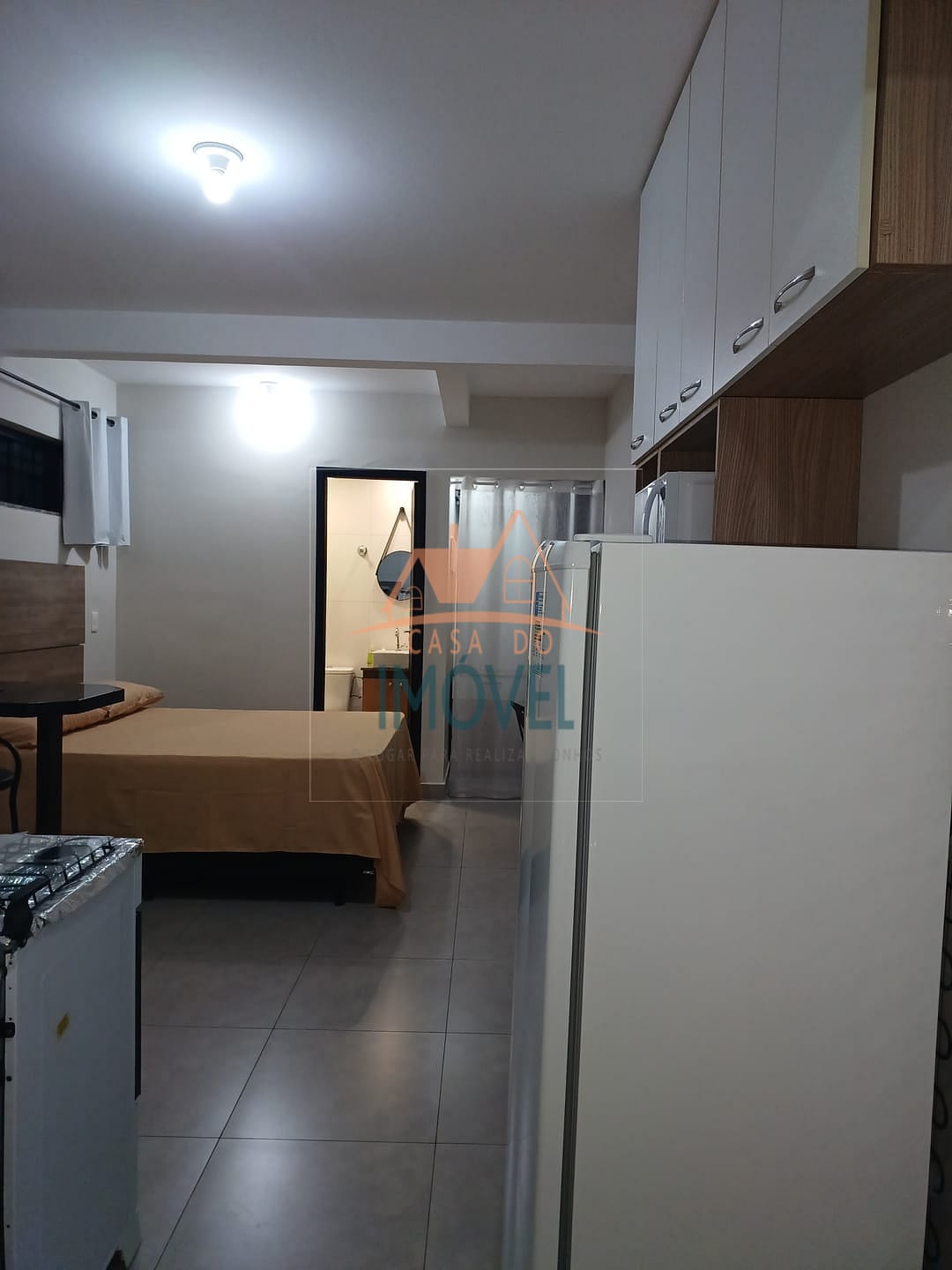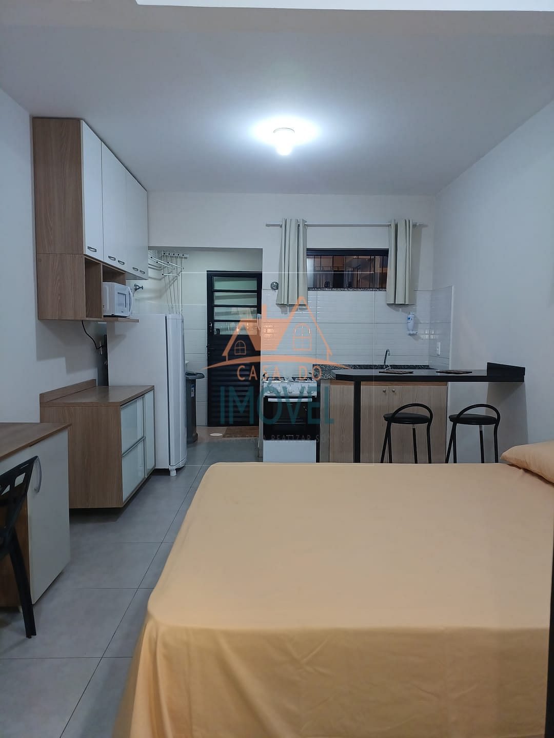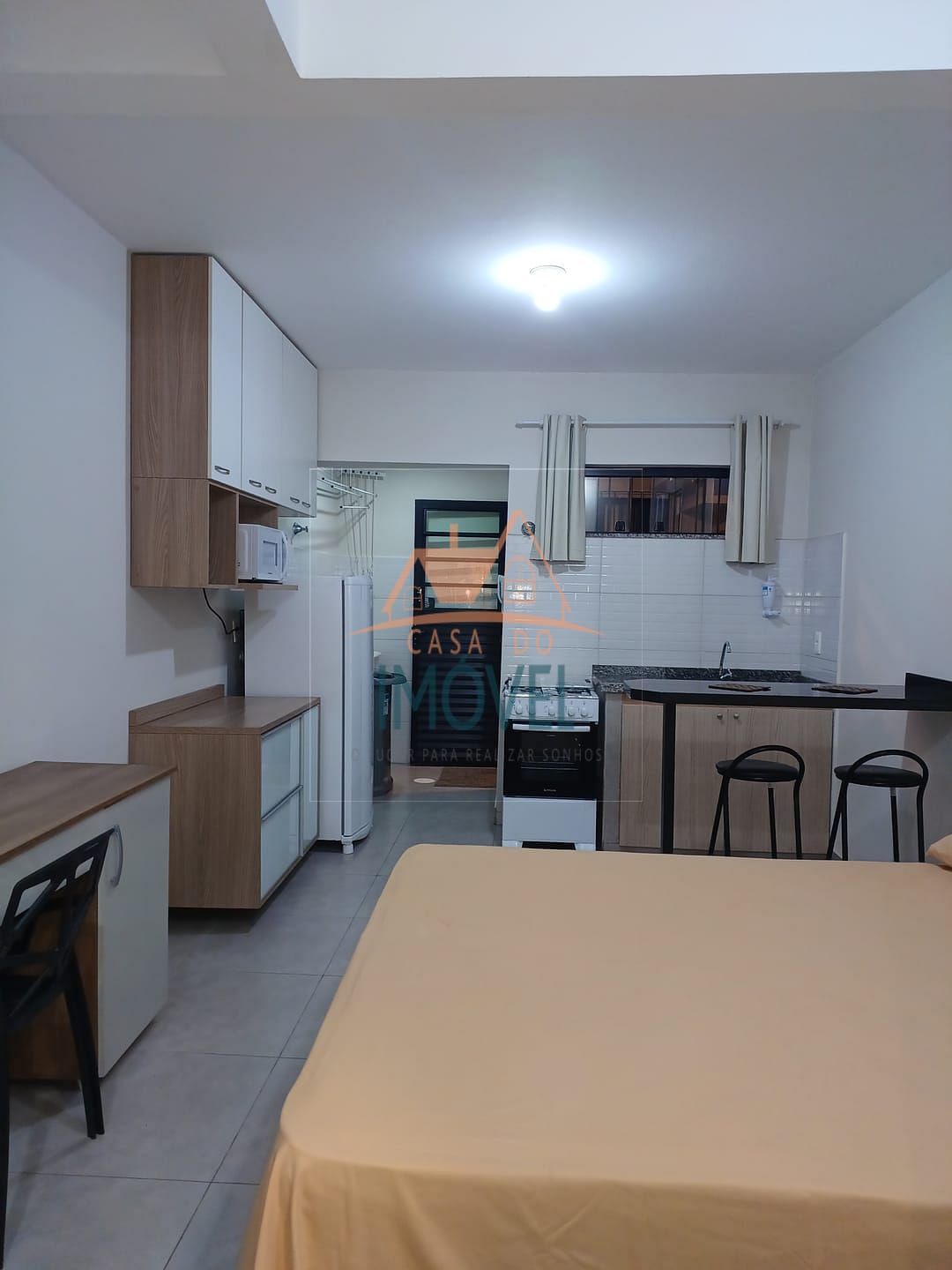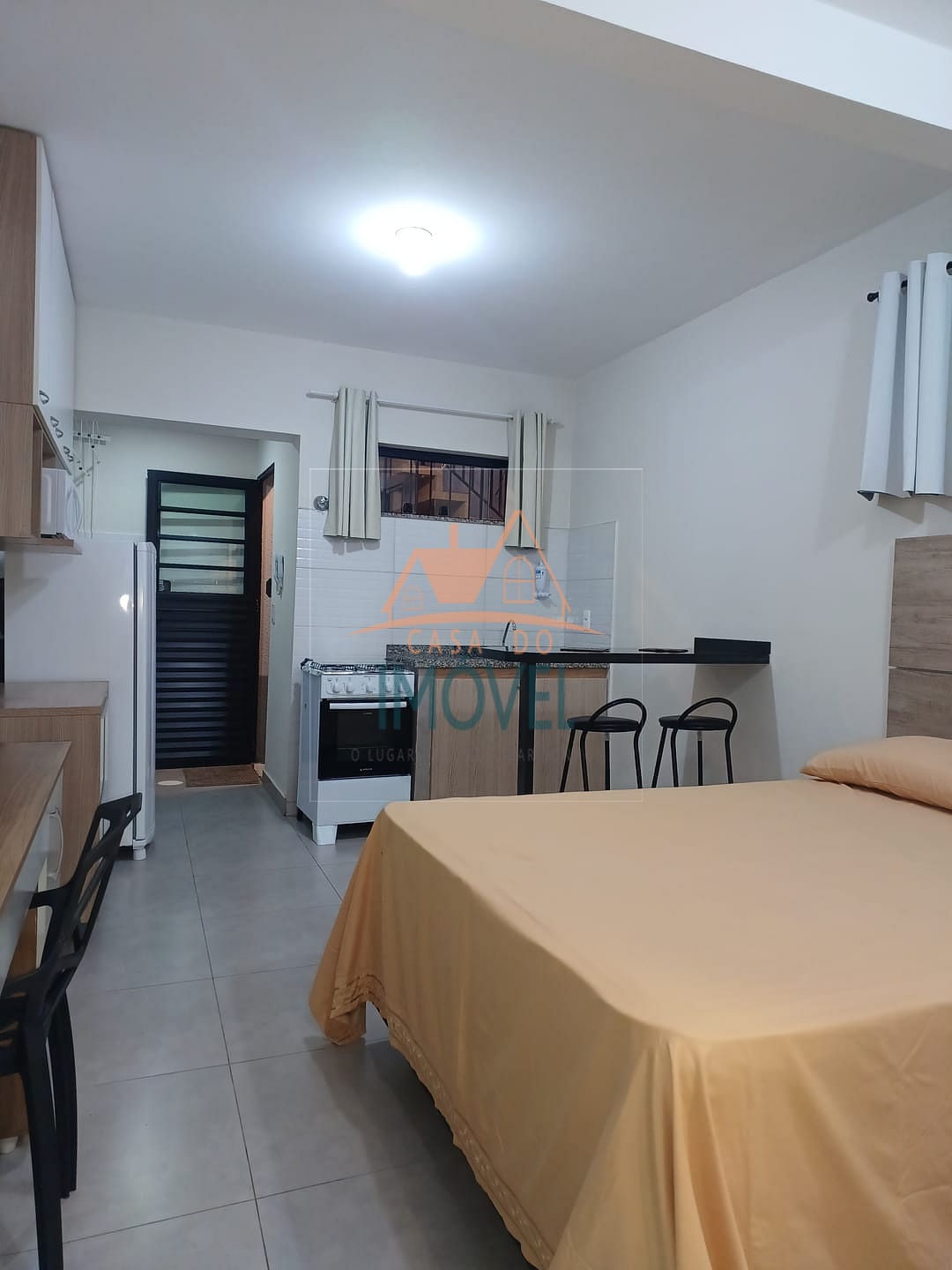 Quitinete com 26m² composta por quarto com cozinha integrada, banheiro, mobiliadas com cama de casal, closet, bancada para refeição com 2 banquetas, geladeira, fogão 4 bocas com forno a gás, armário de cozinha, microondas, escrivaninha com cadeira, máquina de lavar roupa semi-automática (tanquinho), acesso à unidade por fechadura eletrônica.