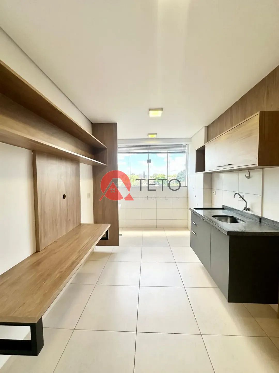 este apartamento conta com uma sala dois ambientes com painel de Tv,