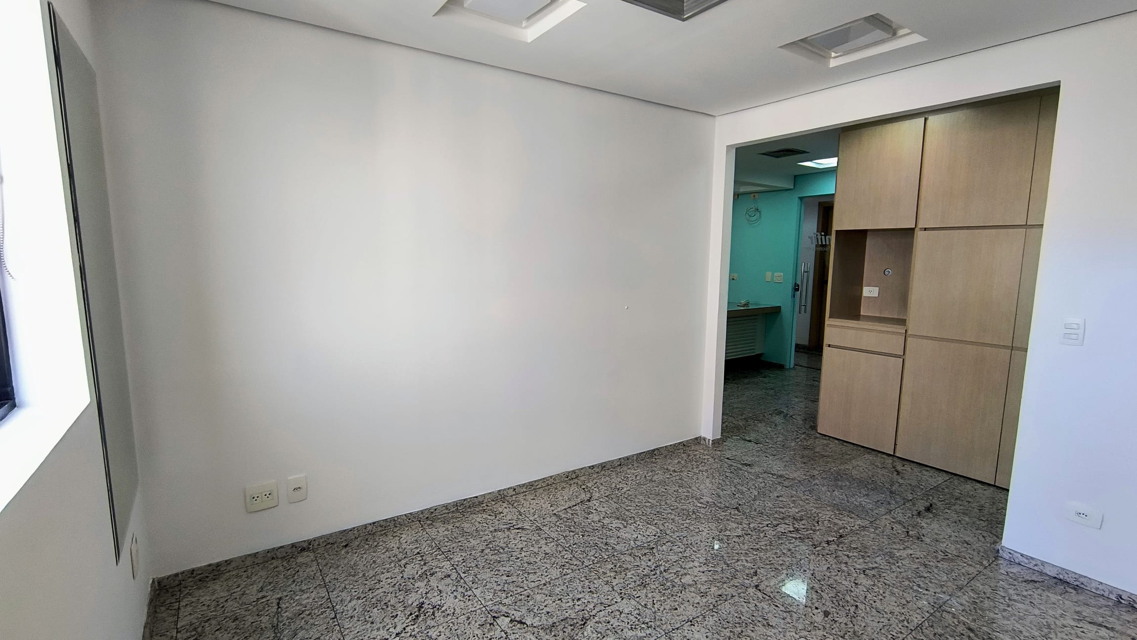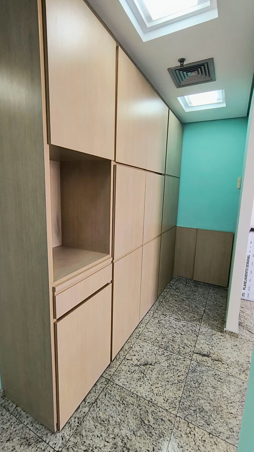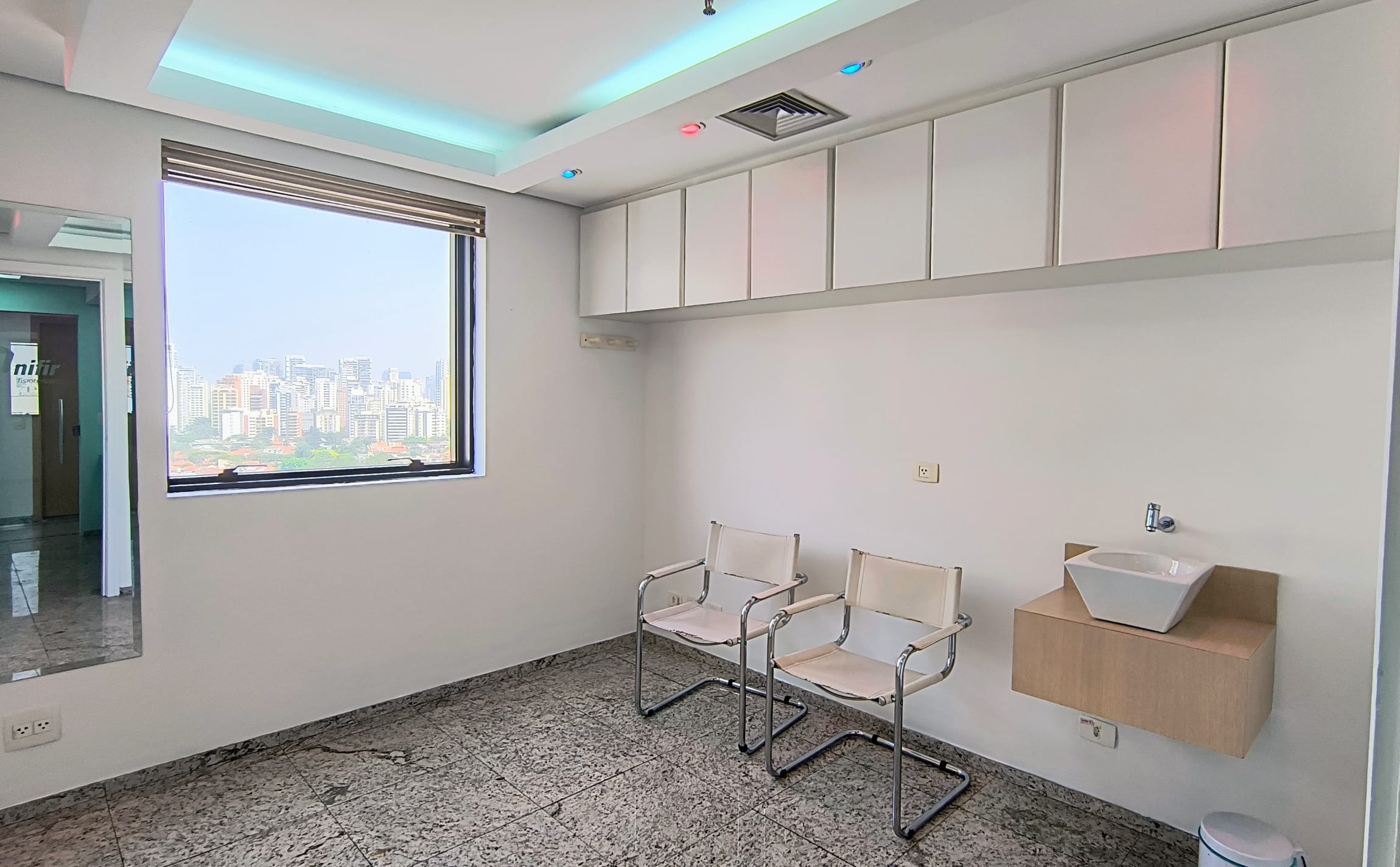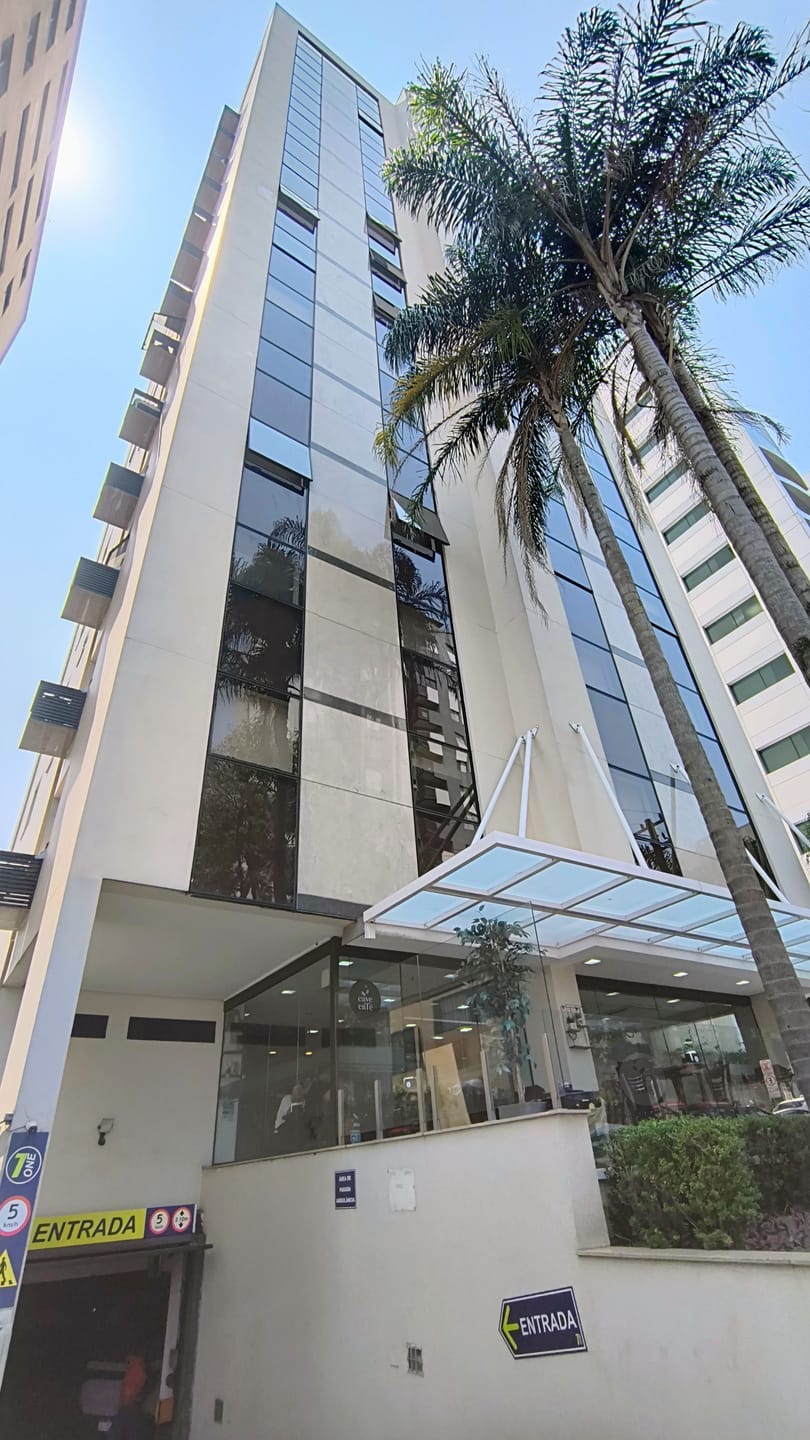 A sala em questão é extremamente funcional, contando com uma recepção, dois banheiros, armários planejados e um espaço reservado para copa e mais duas salas ambas com vista panorâmica. A iluminação natural é um dos pontos fortes, complementada pelo acabamento em piso de granito, forro de gesso com rede de sprinklers e luminárias embutidas, garantindo um ambiente agradável e seguro. E para maior comodidade, a sala ainda oferece duas vagas de garagem exclusivas, facilitando o acesso de clientes e colaboradores.