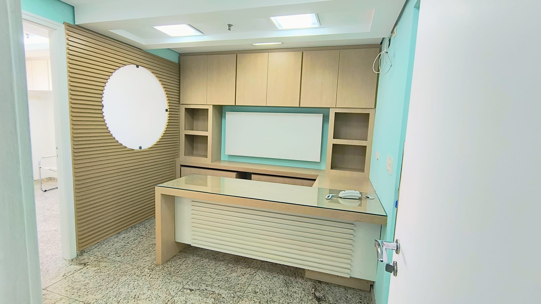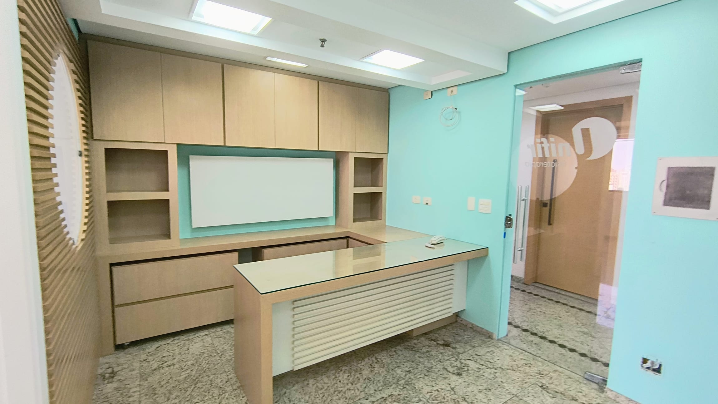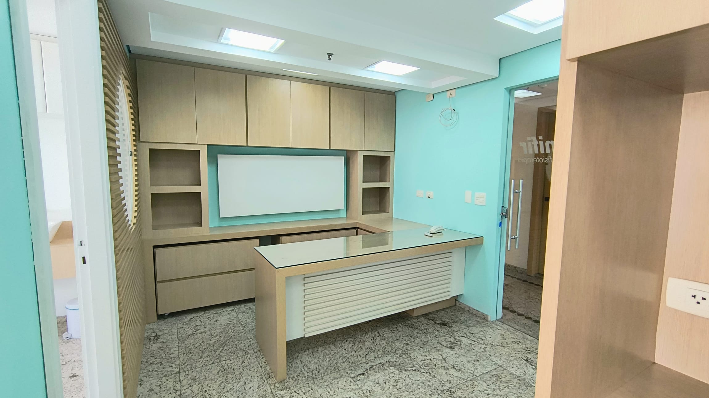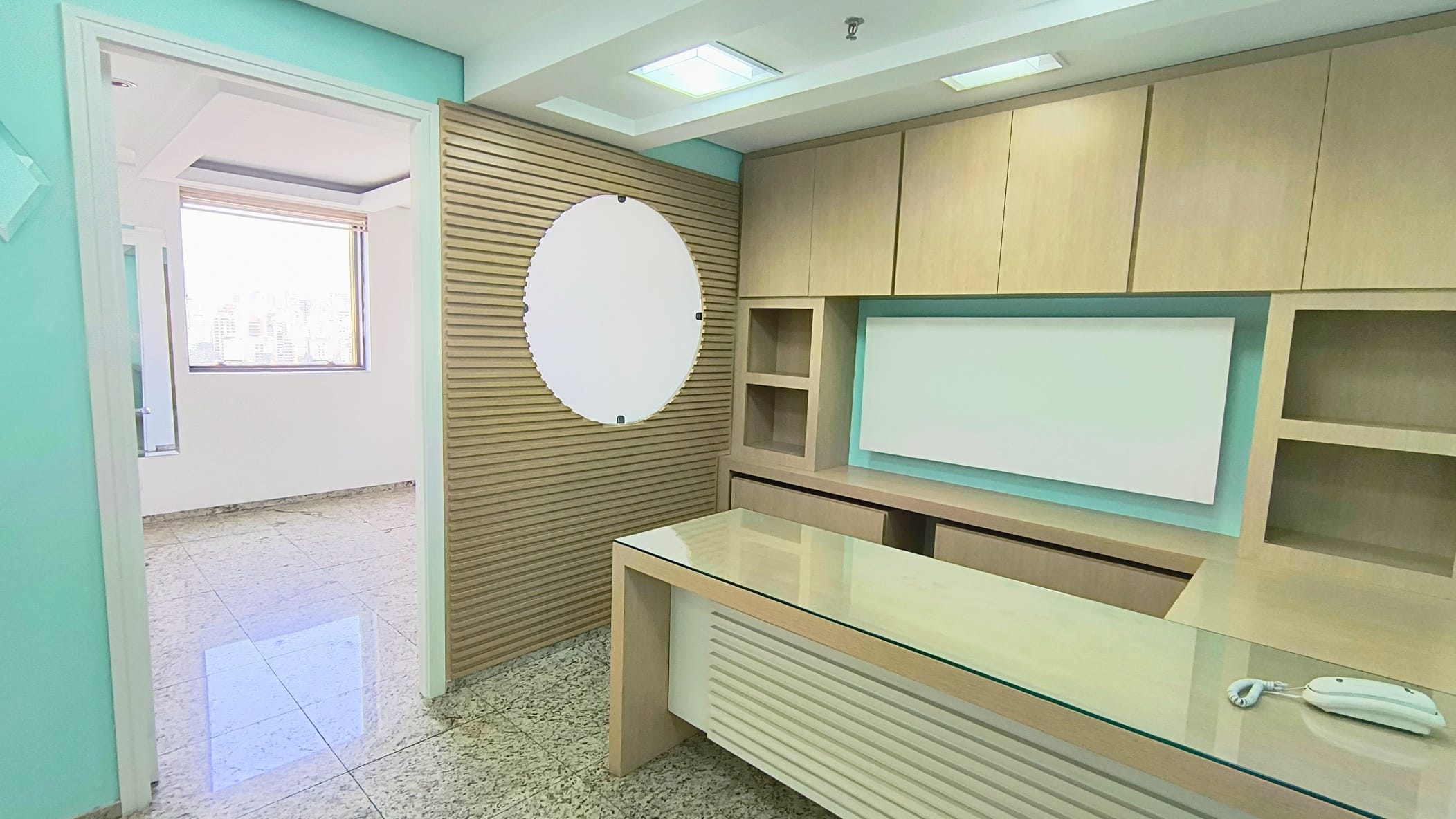 A sala em questão é extremamente funcional, contando com uma recepção, dois banheiros, armários planejados e um espaço reservado para copa e mais duas salas ambas com vista panorâmica. A iluminação natural é um dos pontos fortes, complementada pelo acabamento em piso de granito, forro de gesso com rede de sprinklers e luminárias embutidas, garantindo um ambiente agradável e seguro. E para maior comodidade, a sala ainda oferece duas vagas de garagem exclusivas, facilitando o acesso de clientes e colaboradores.