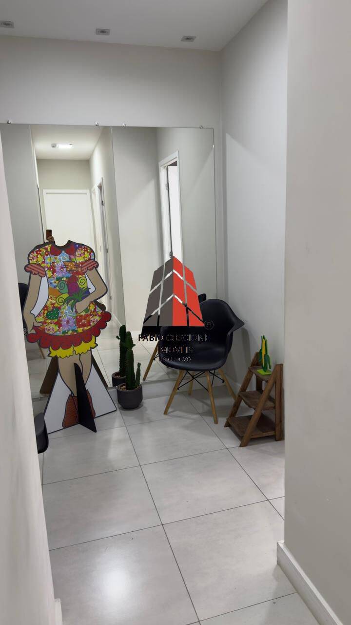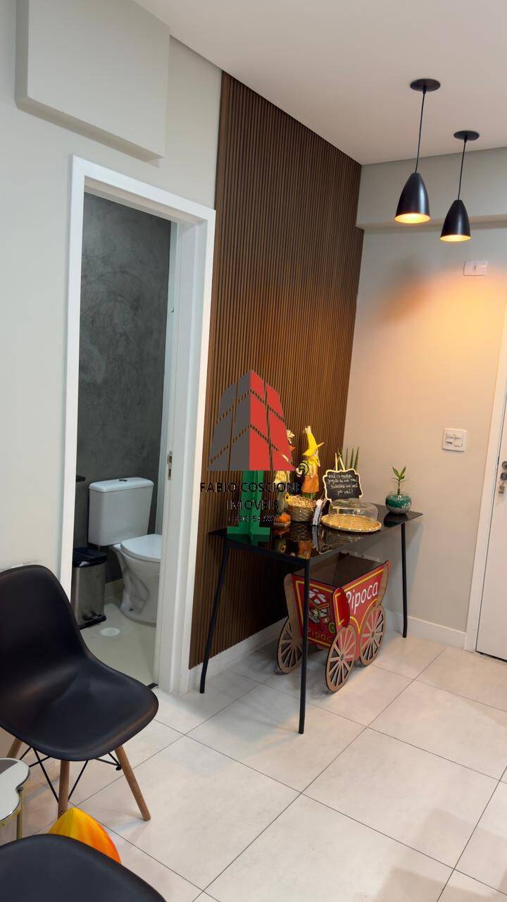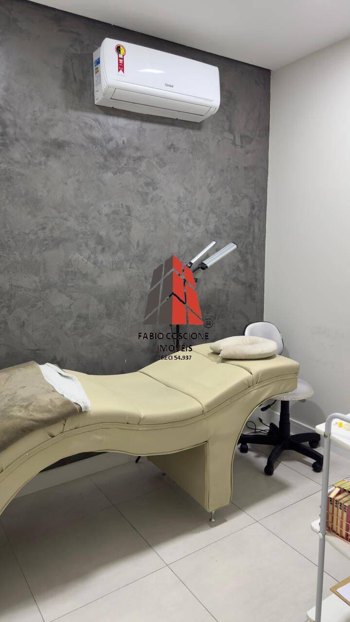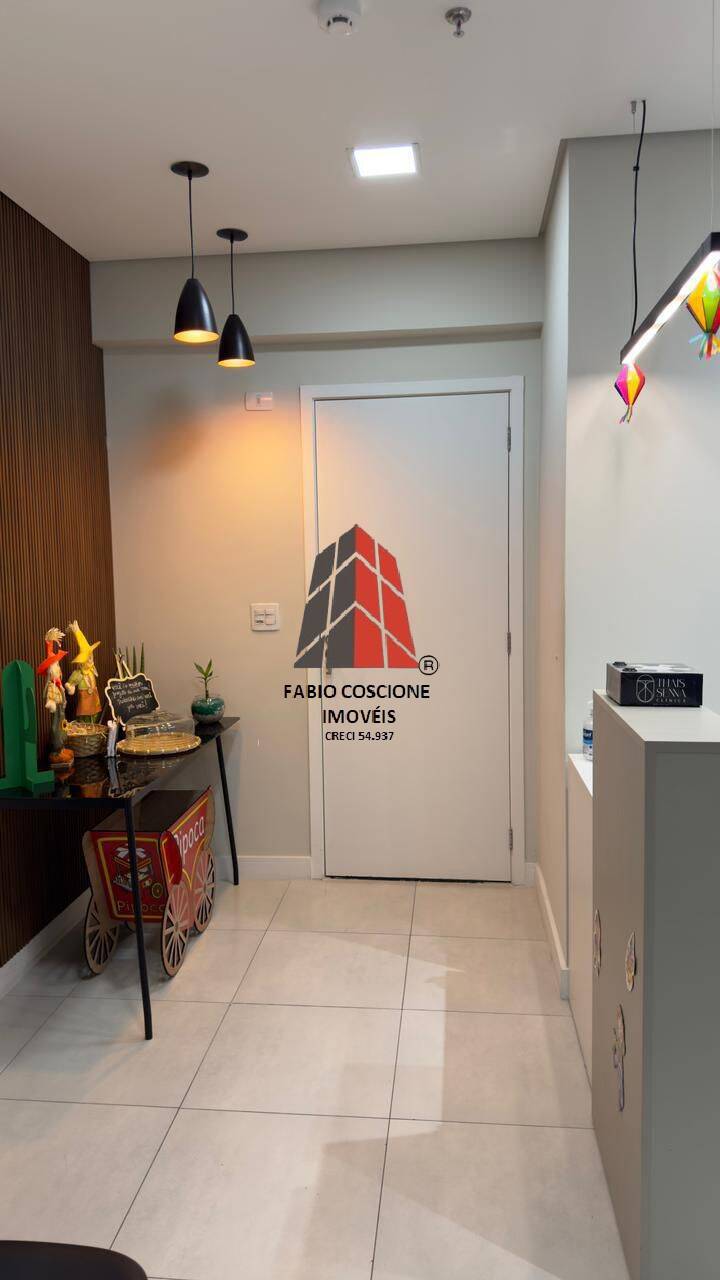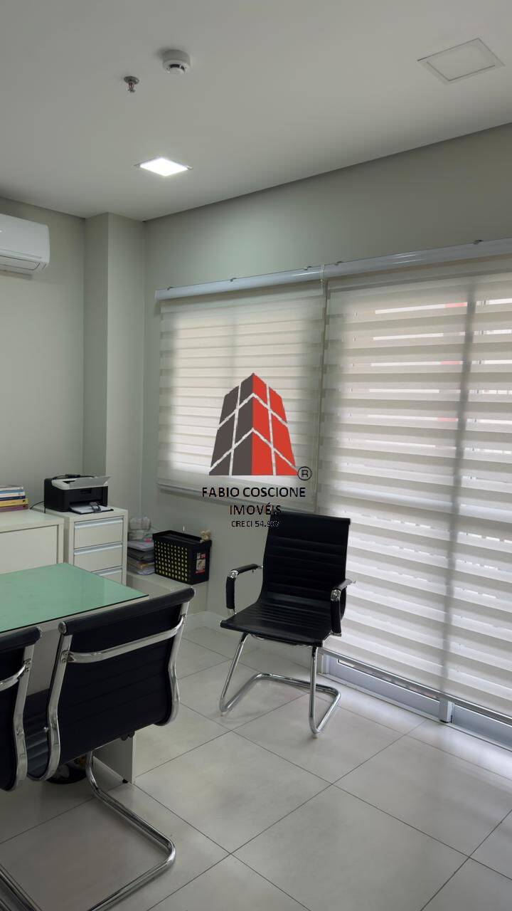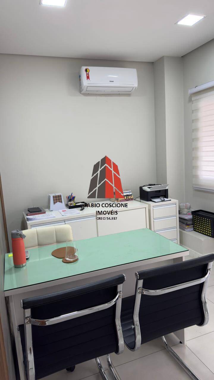 A sala com piso em porcelanato, copa, recepção , persianas, ar condicionado, mobiliada.