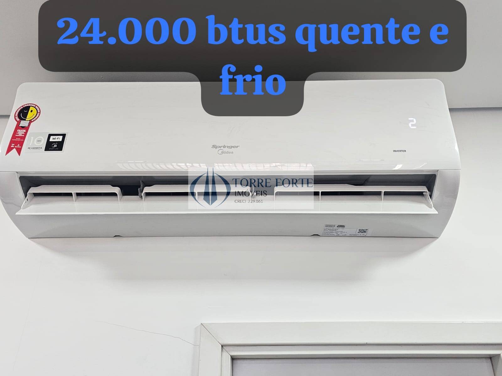 Ar condicionado quente e frio, banheiro e pequeno espaço para layout de uma copa.