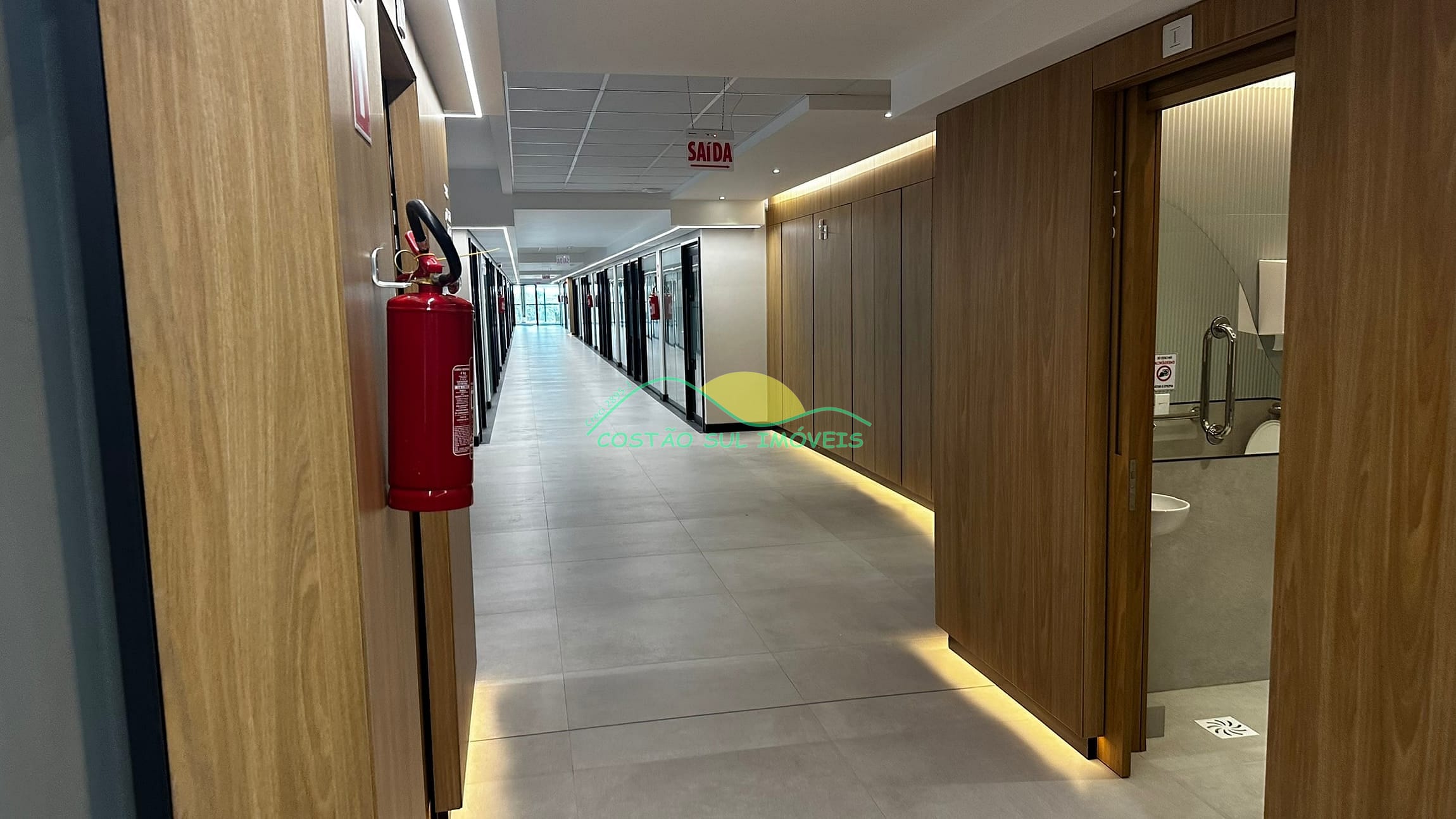 Cada sala possui um banheiro e uma vaga de garagem.