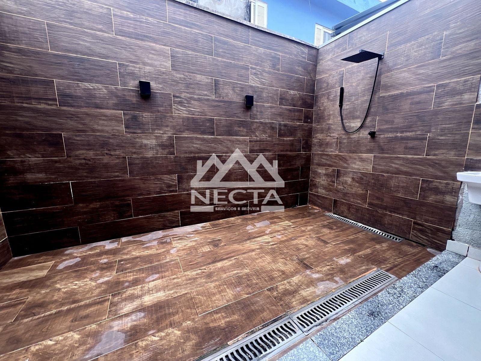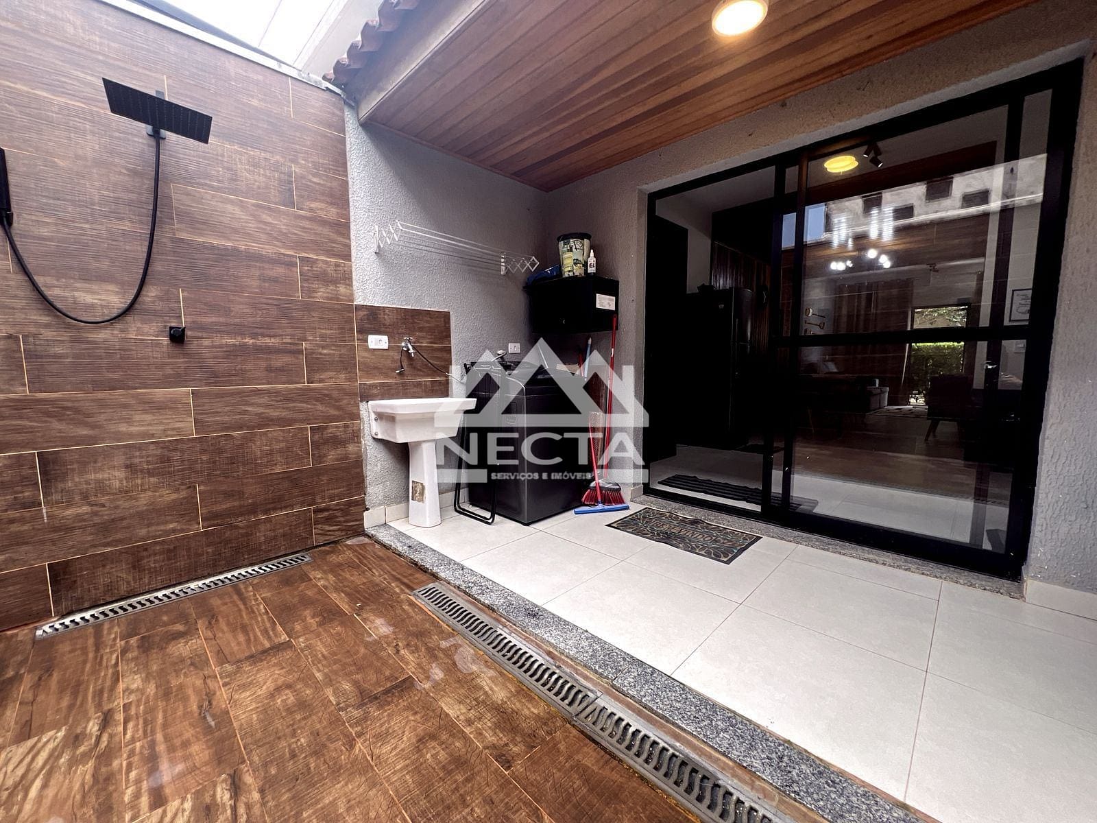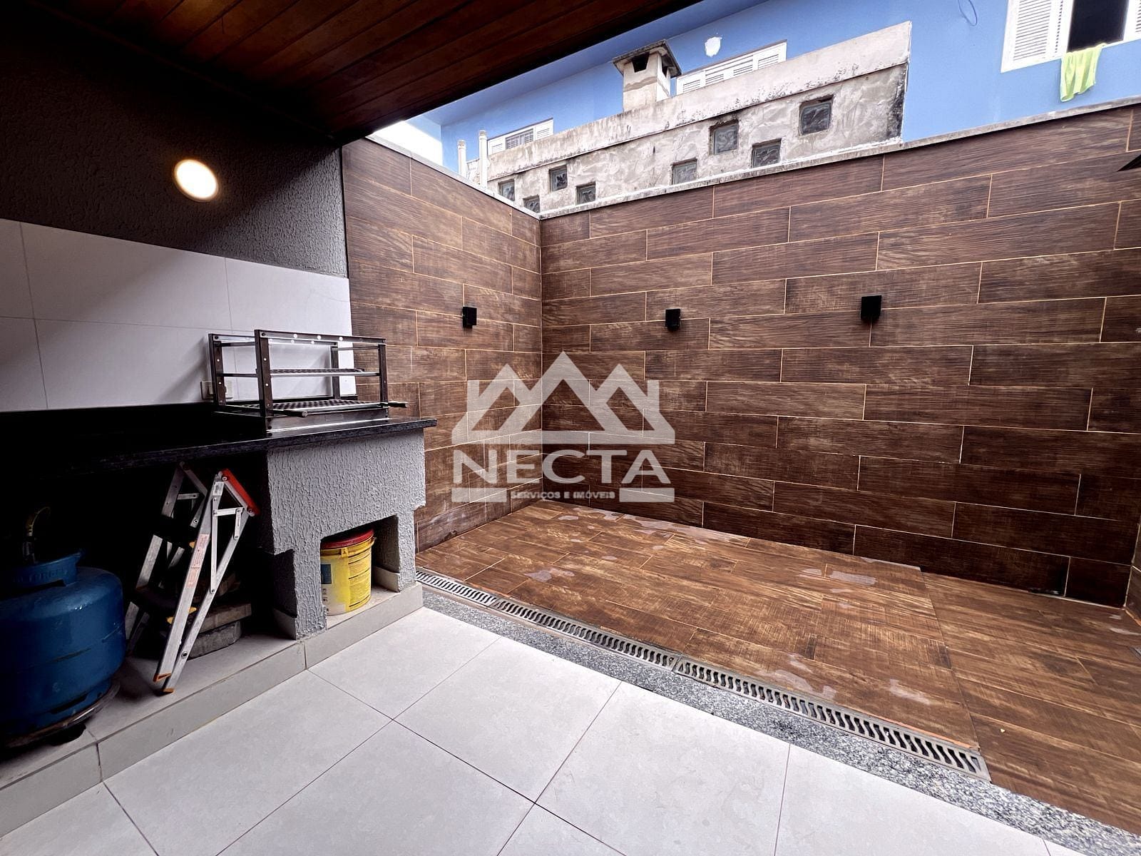 Área externa com churrasqueira e ducha