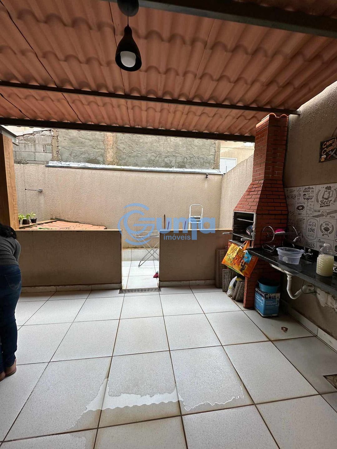 Quintal com churrasqueira e área de serviço coberta