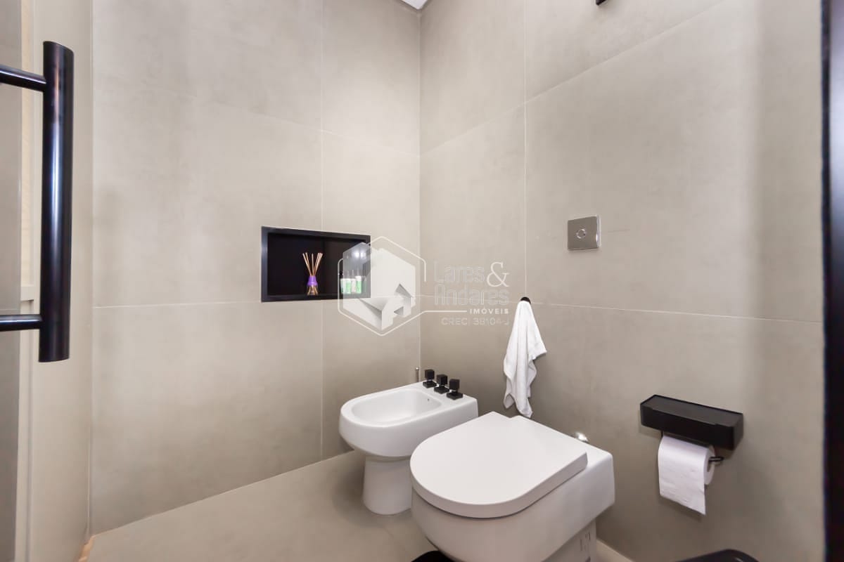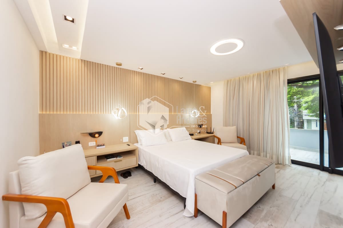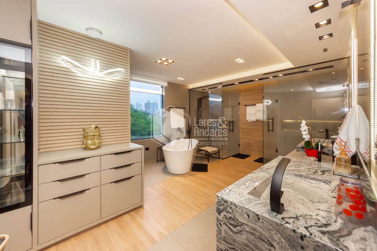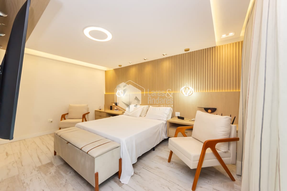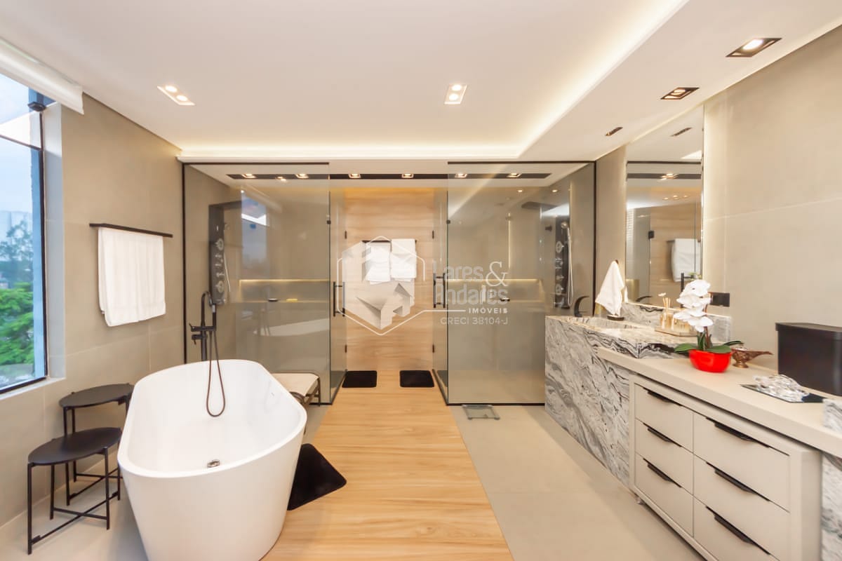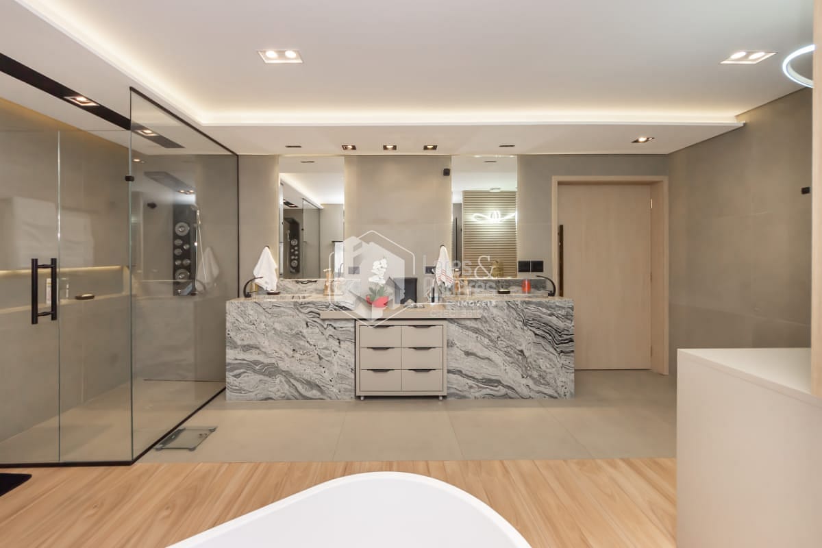 - 1 máster suíte no piso superior com sacada, ampla sala de banho e closet