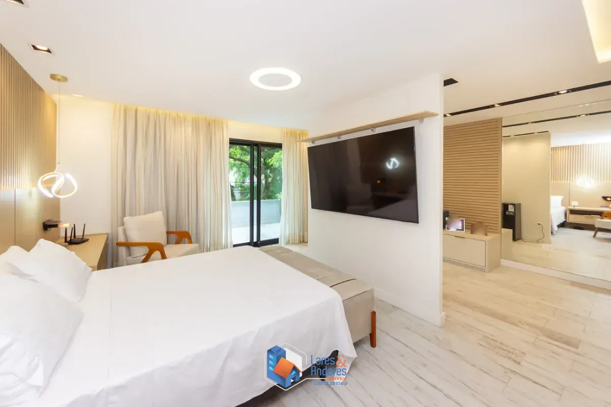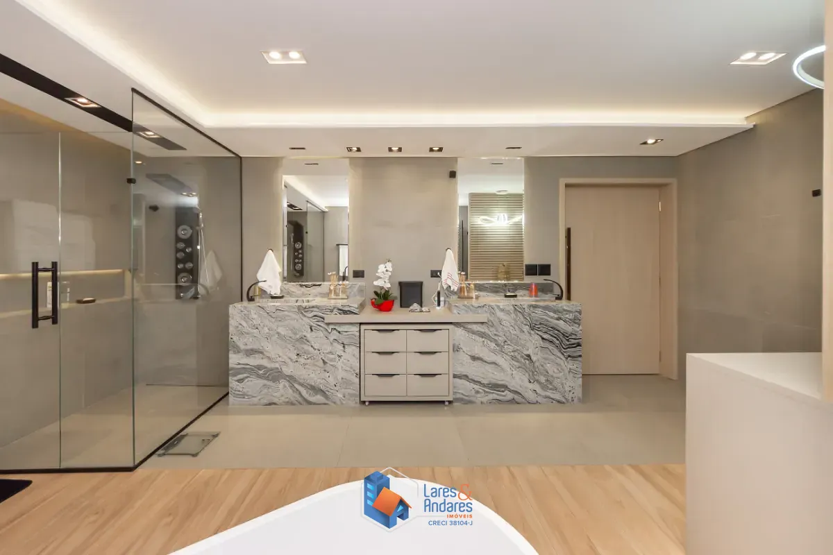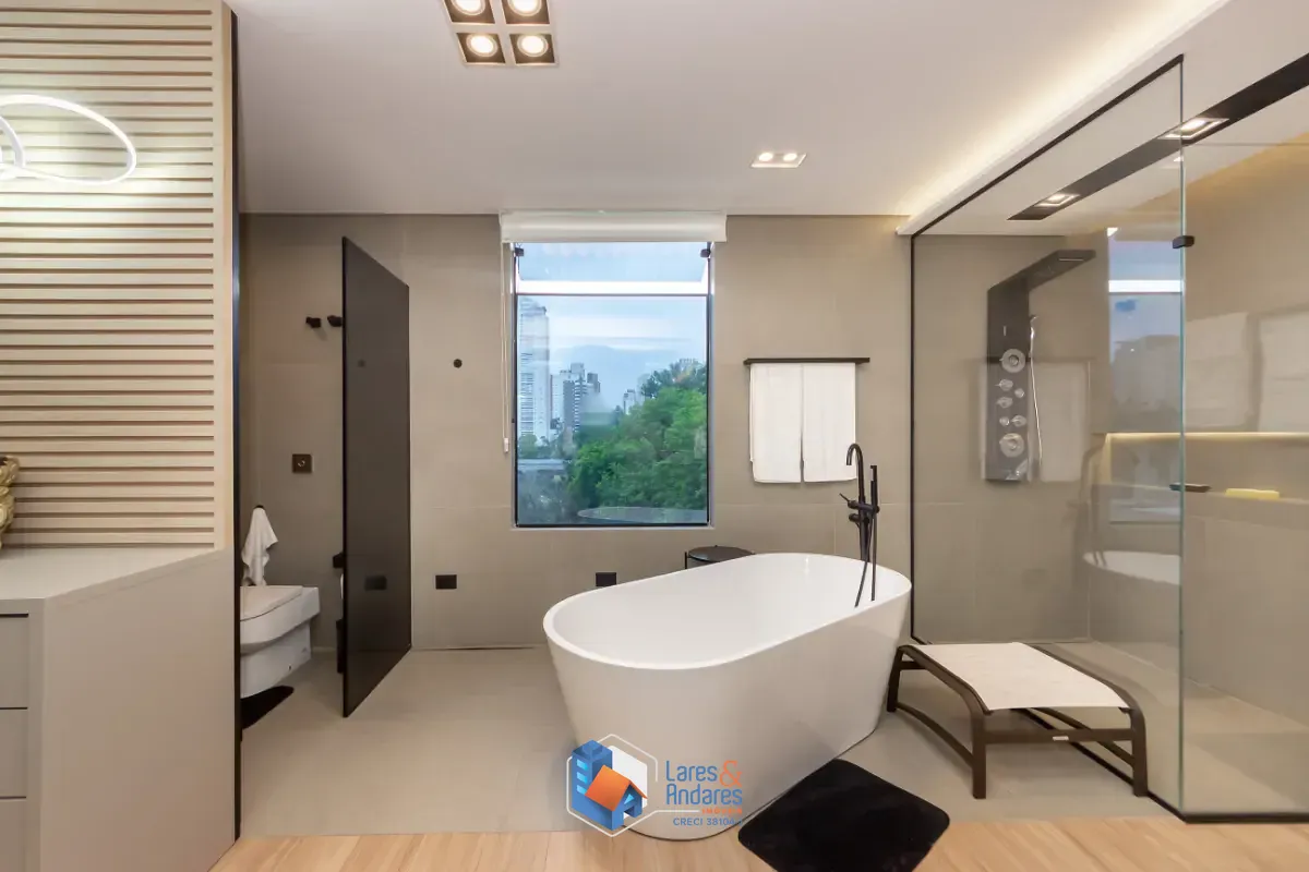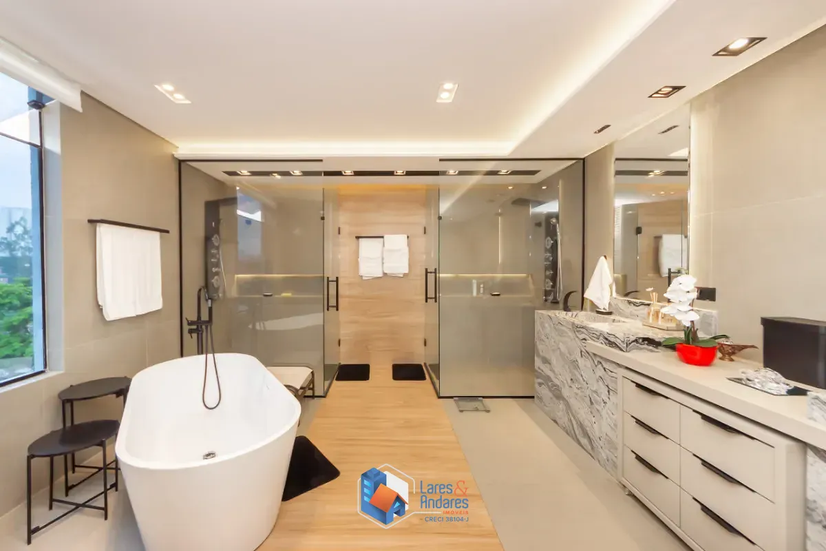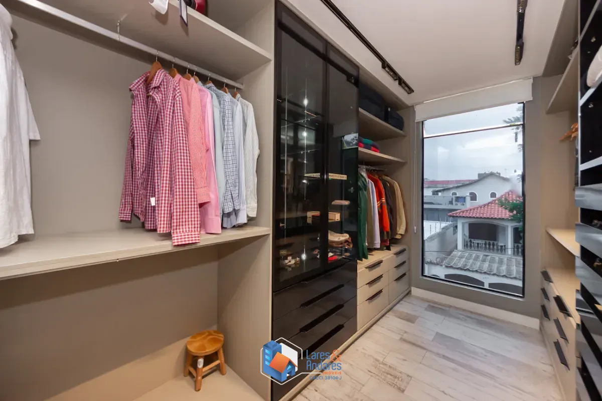 - 1 máster suíte no piso superior com sacada, ampla sala de banho e closet