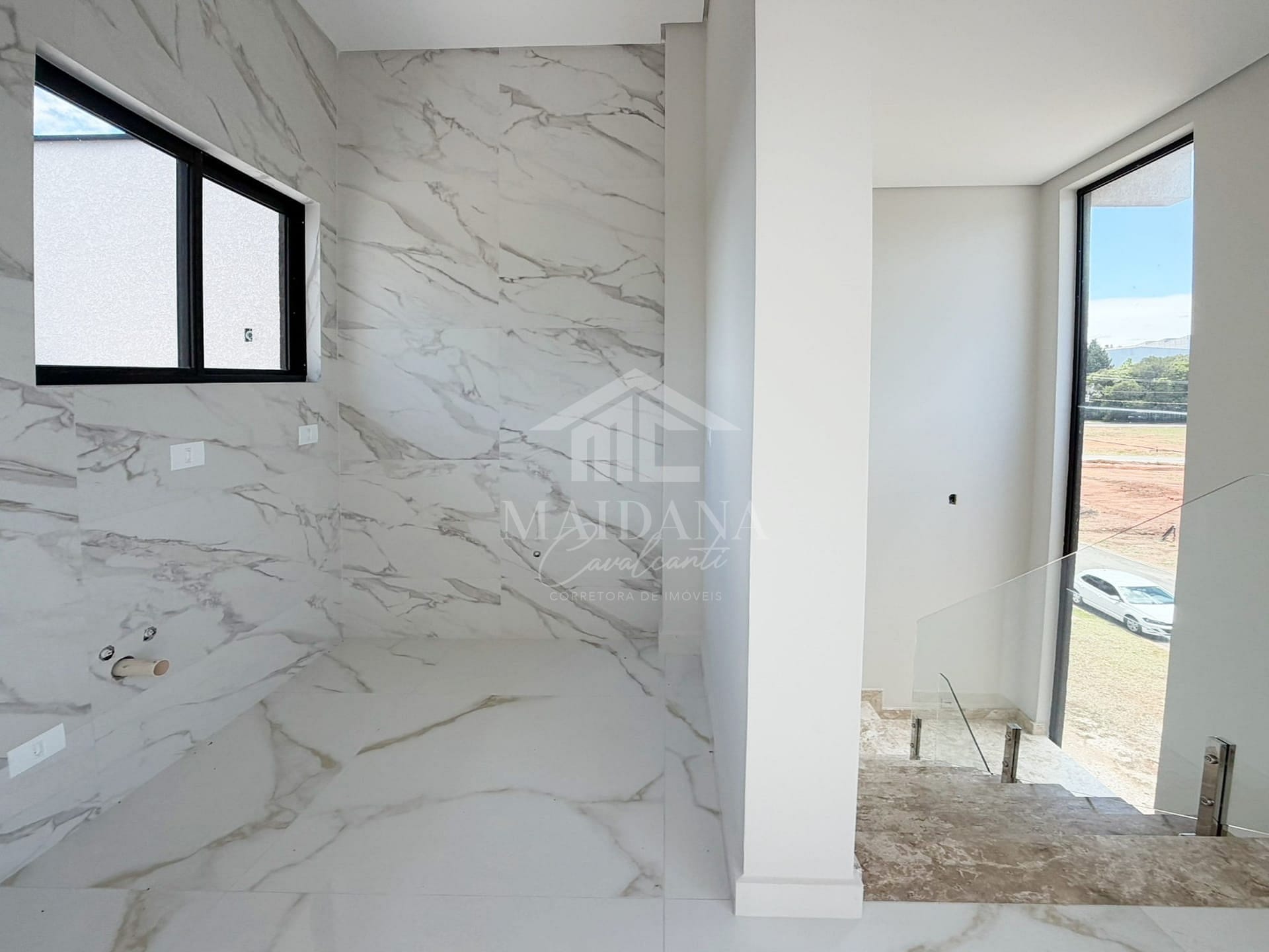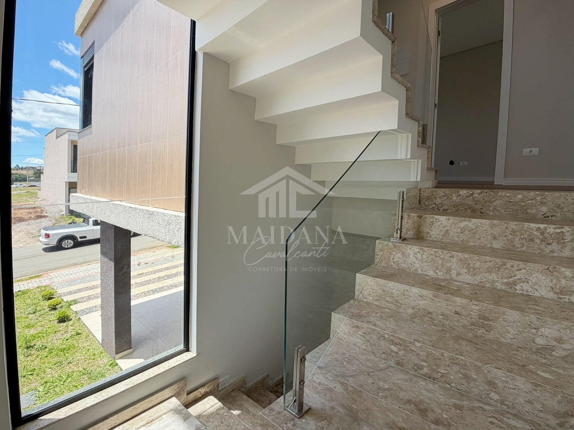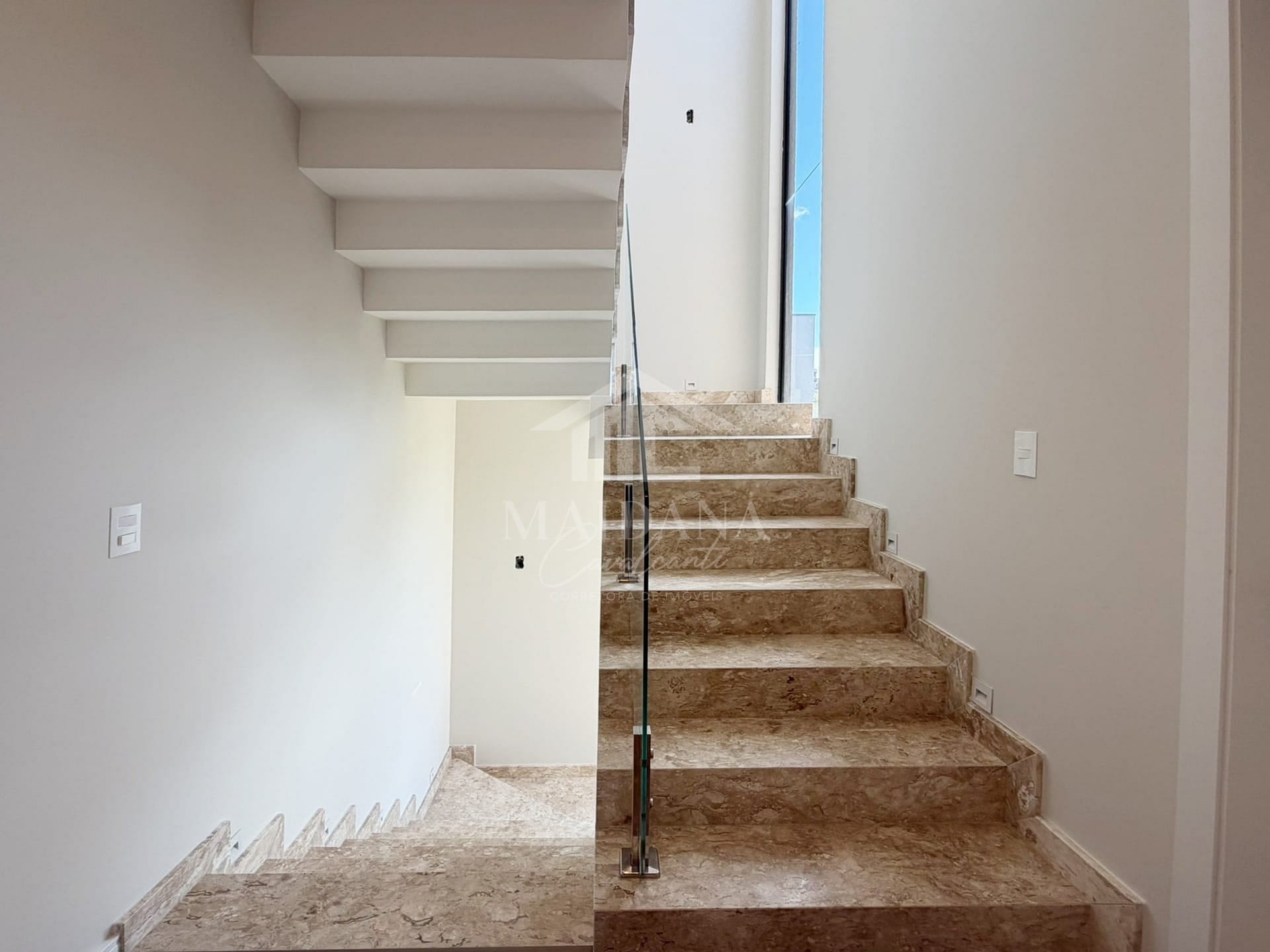 - Escada em travertino com corrimão em vidro