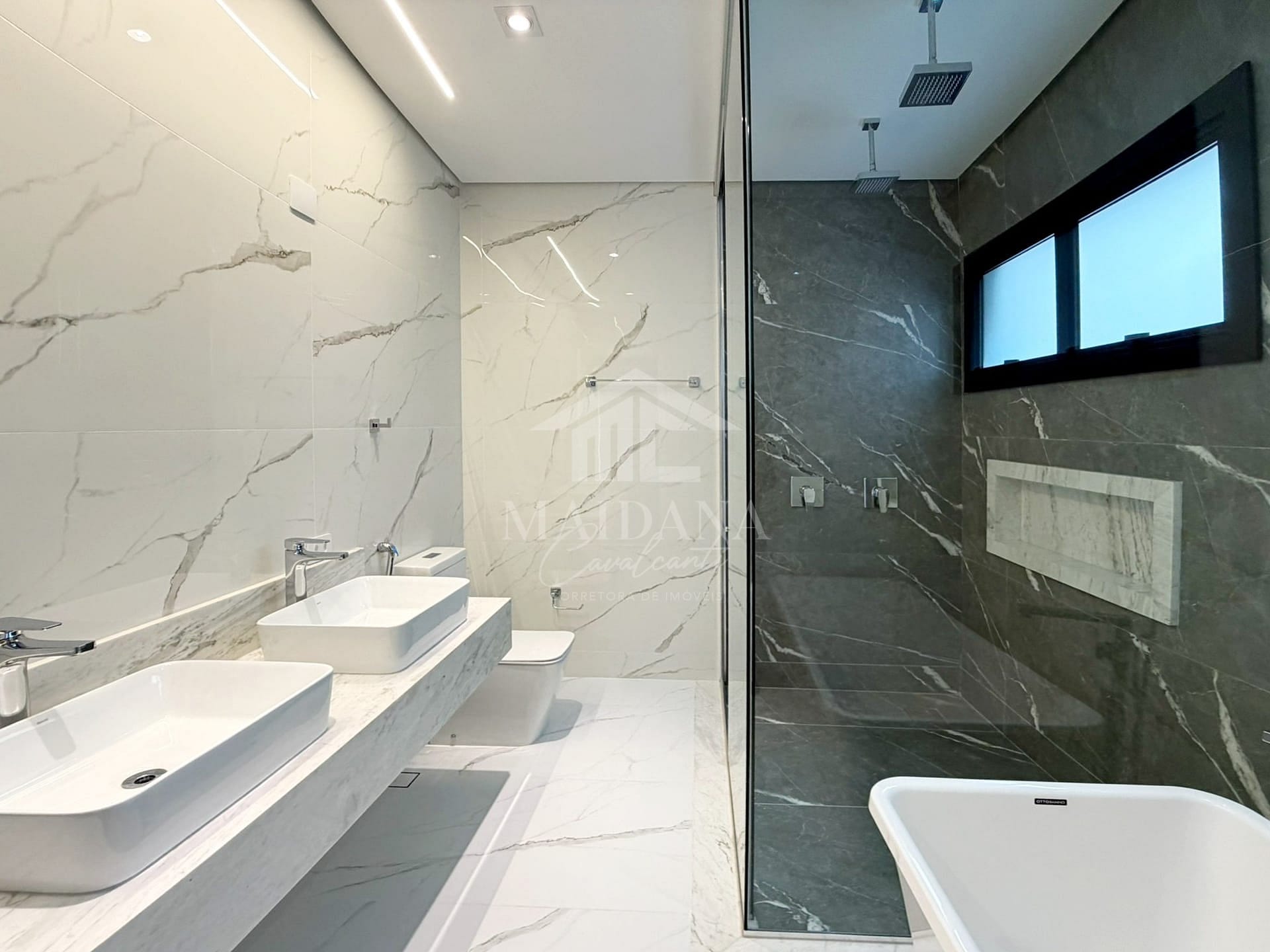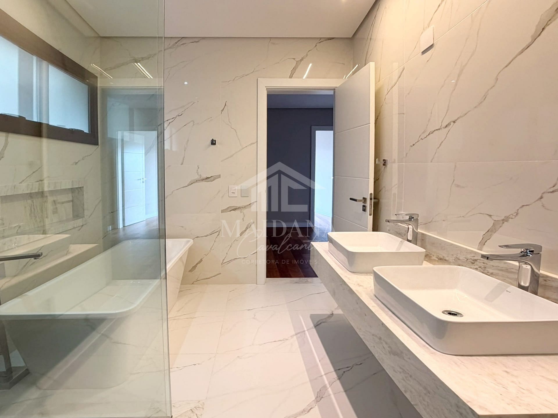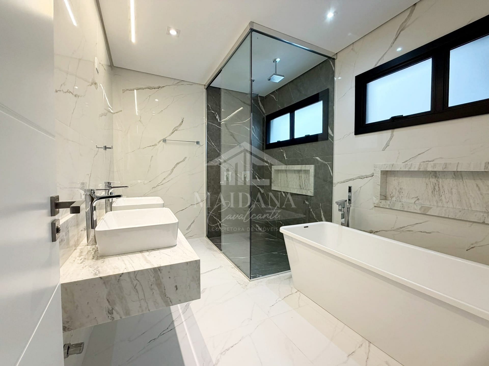 - Suíte master com closet, banheira de imersão, ducha dupla e pia dupla