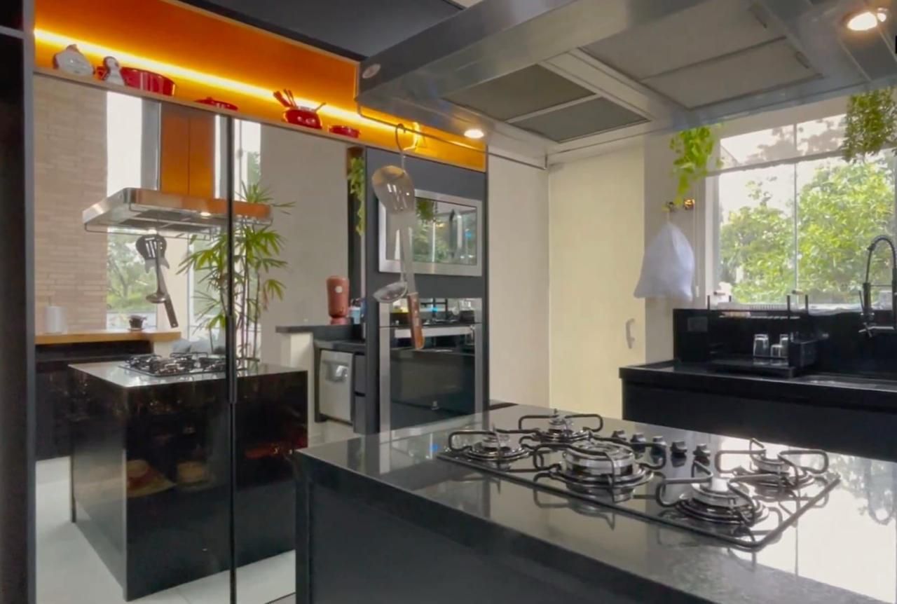 Equipamentos embutidos: cooktop, coifa profissional Pulsar, forno elétrico, micro-ondas e lava-louças
