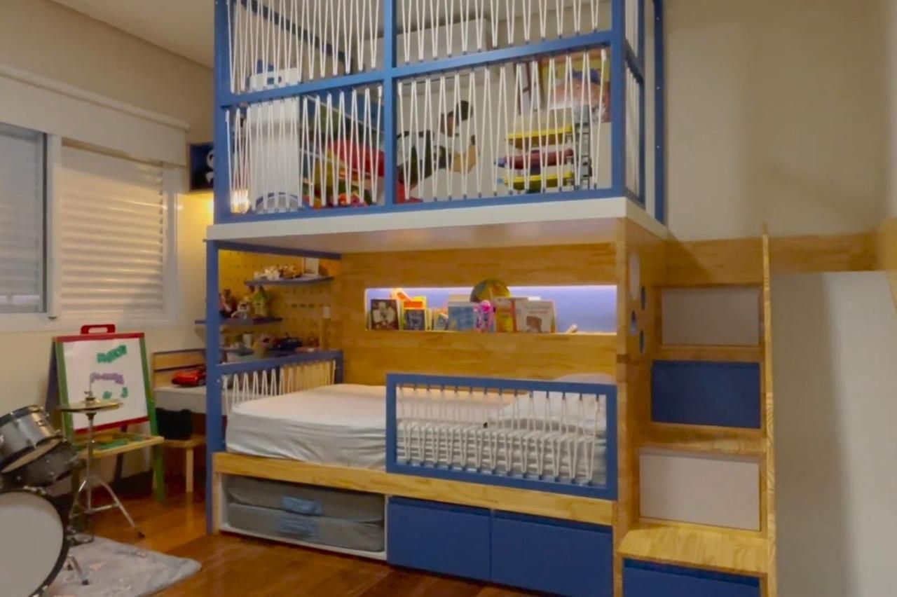 Escadas com gavetões, escorregador integrado, iluminação LED, painel pegboard, livreiro e escrivaninha modular estilo “Crescer”