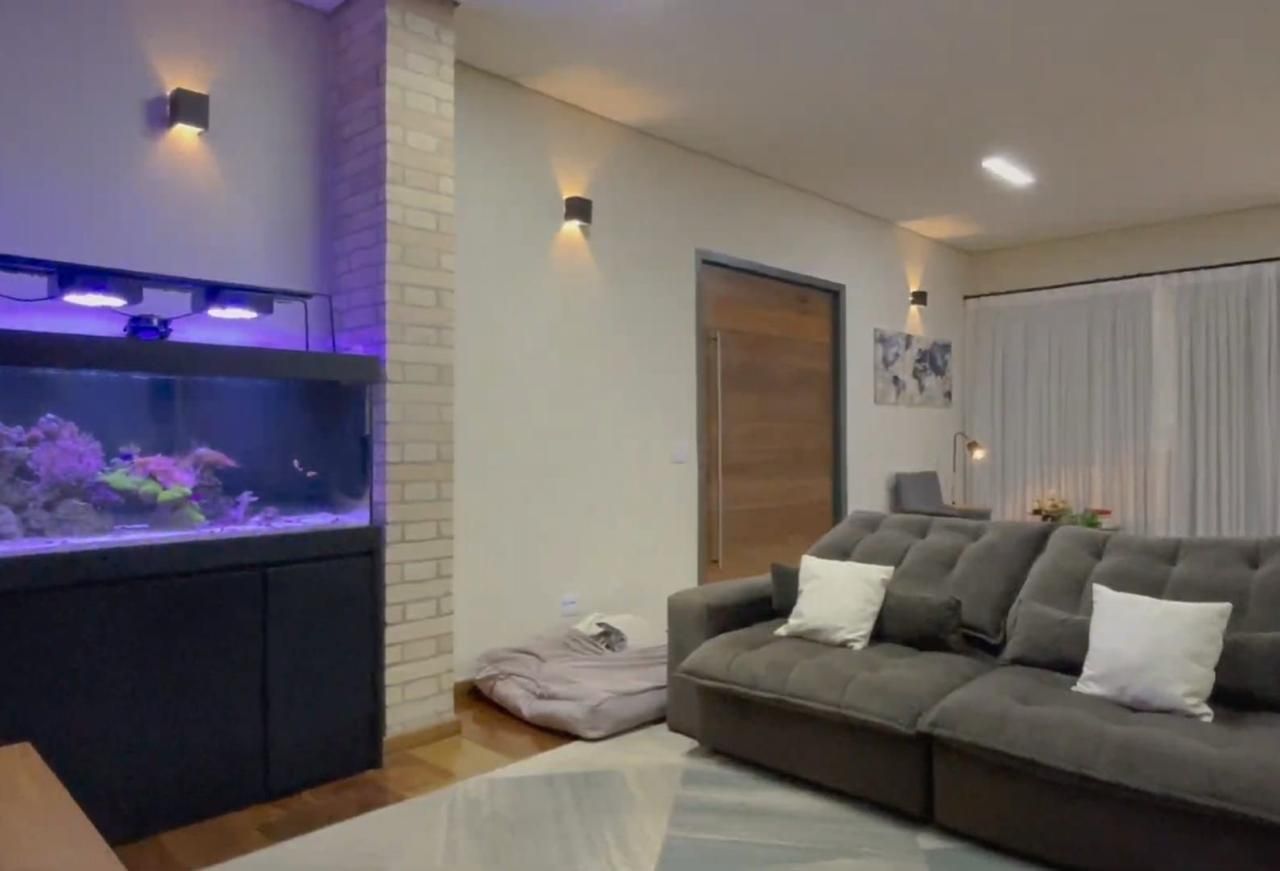 Sala de TV com aquário marinho instalado