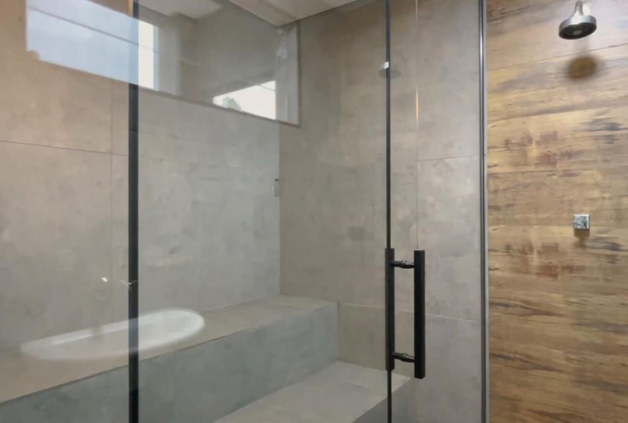 Banheiro completo na área gourmet, com acesso direto à piscina e sauna