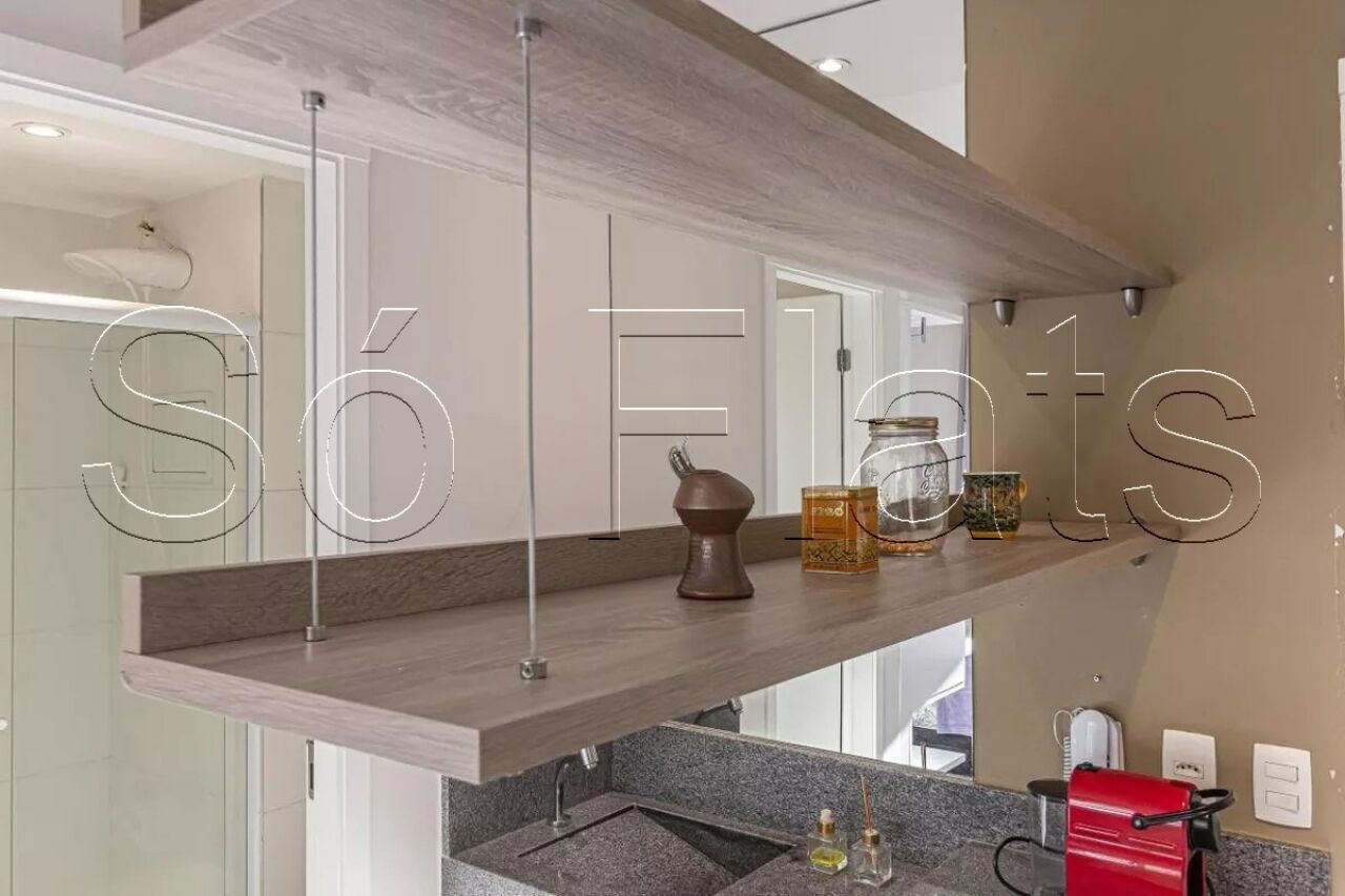 O apartamento disponível segue o modelo studio, moderno, mobiliado e totalmente equipado, com 35m² muito bem distribuídos em um dormitório integrado, cozinha americana funcional, uma linda varanda fechada com vidro que amplia a sensação de espaço e iluminação natural, além de contar com uma vaga de garagem.
