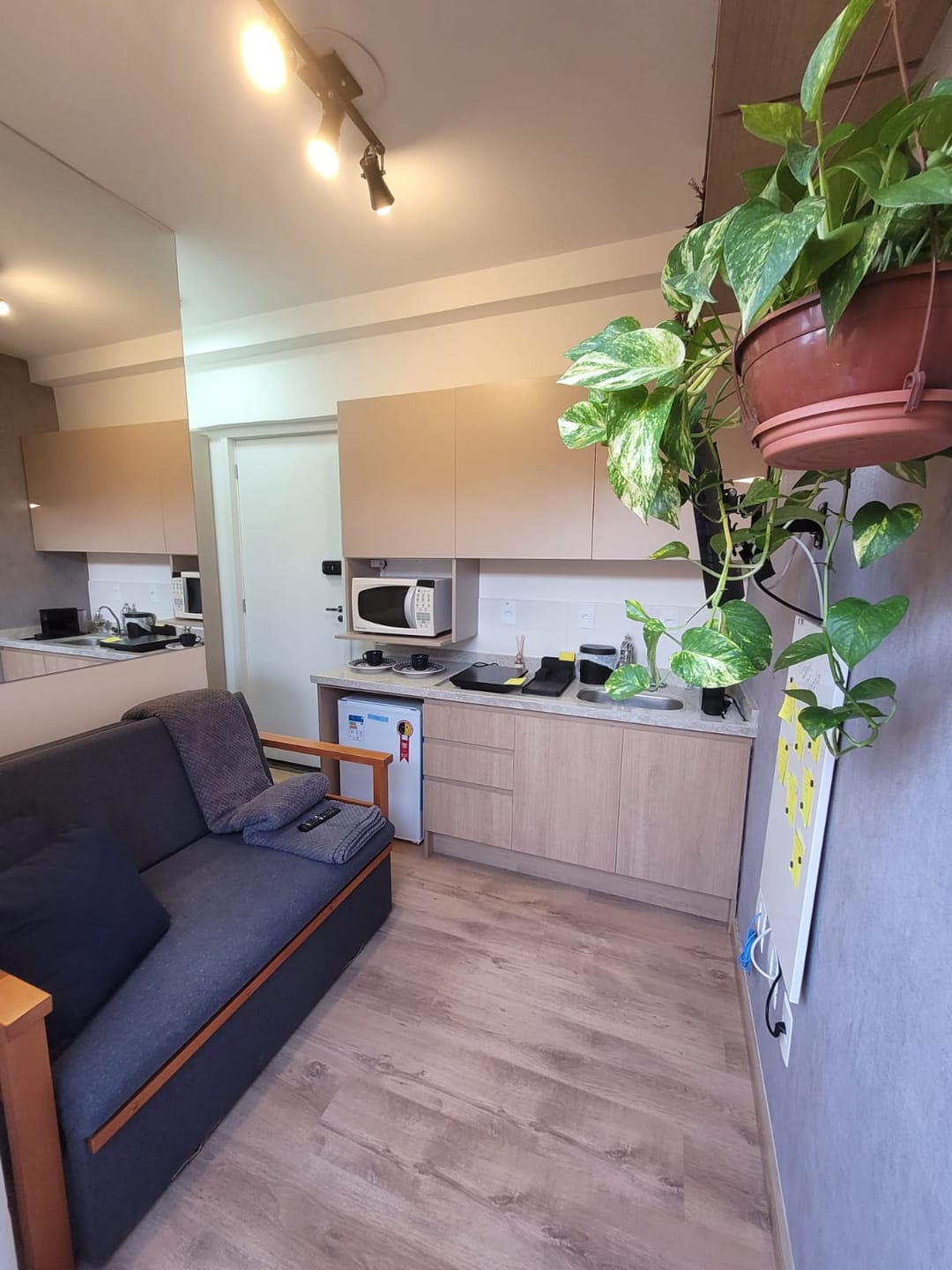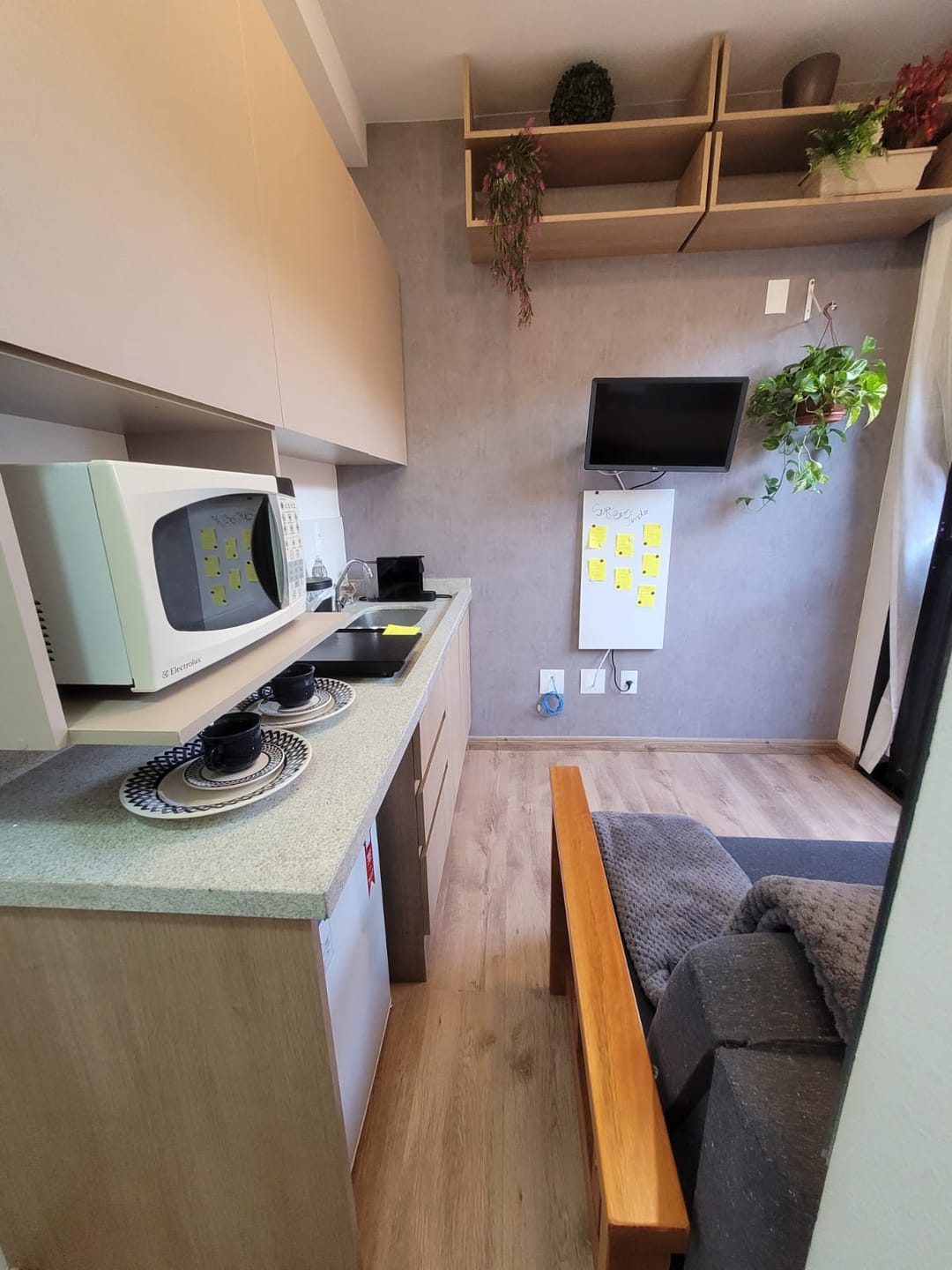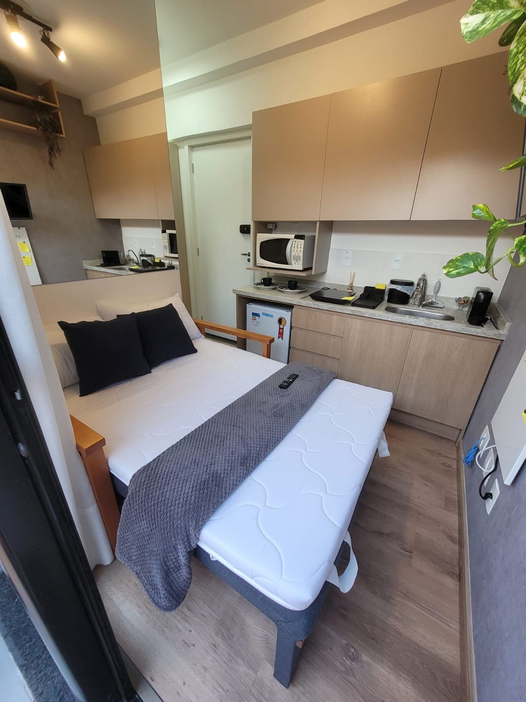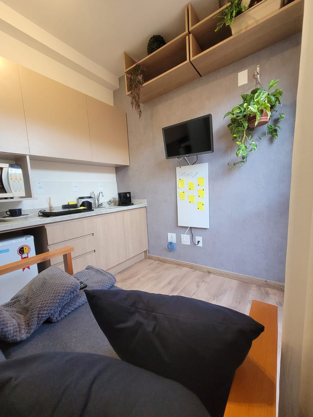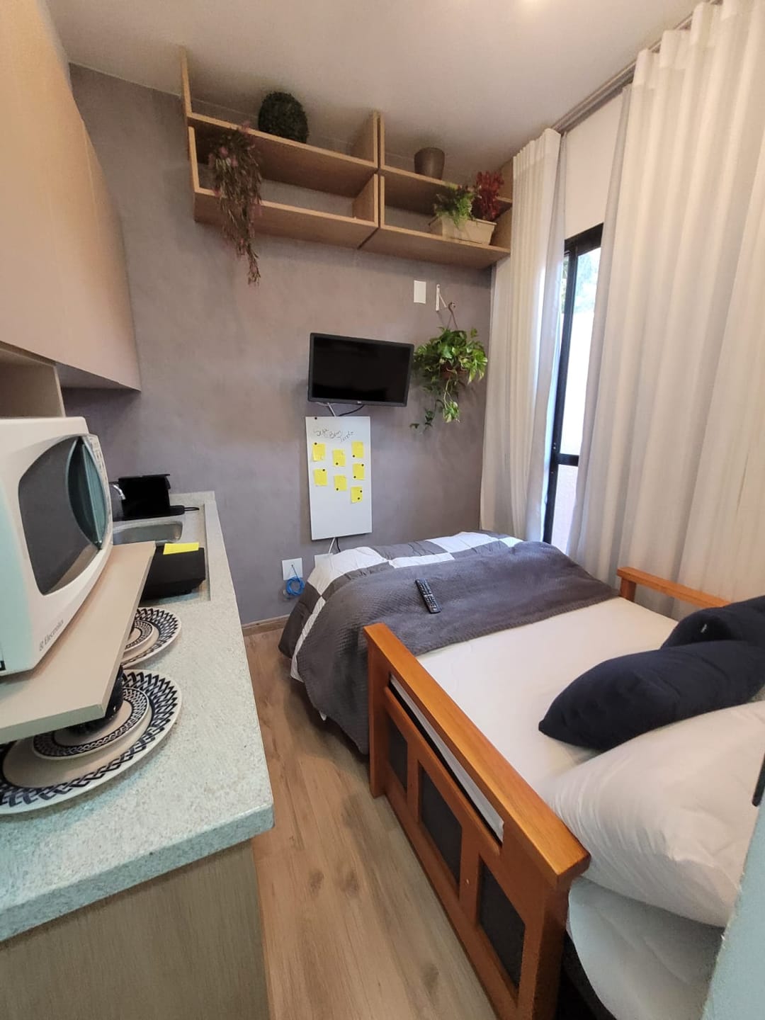 O Studio já vem completamente mobiliado e equipado com: