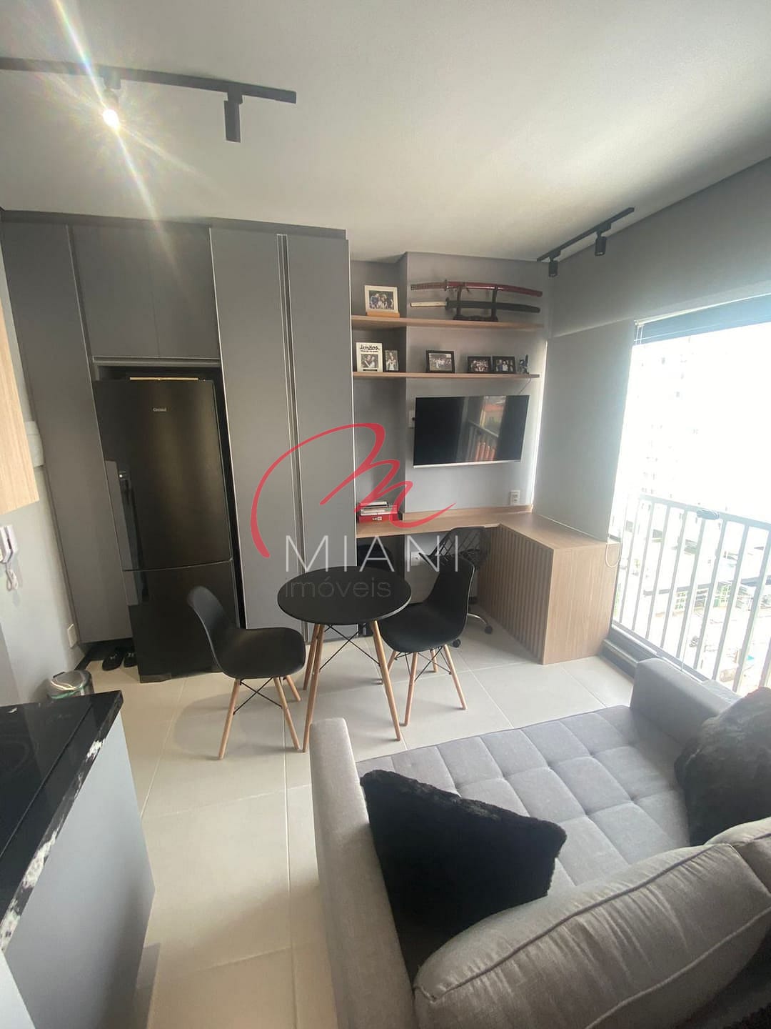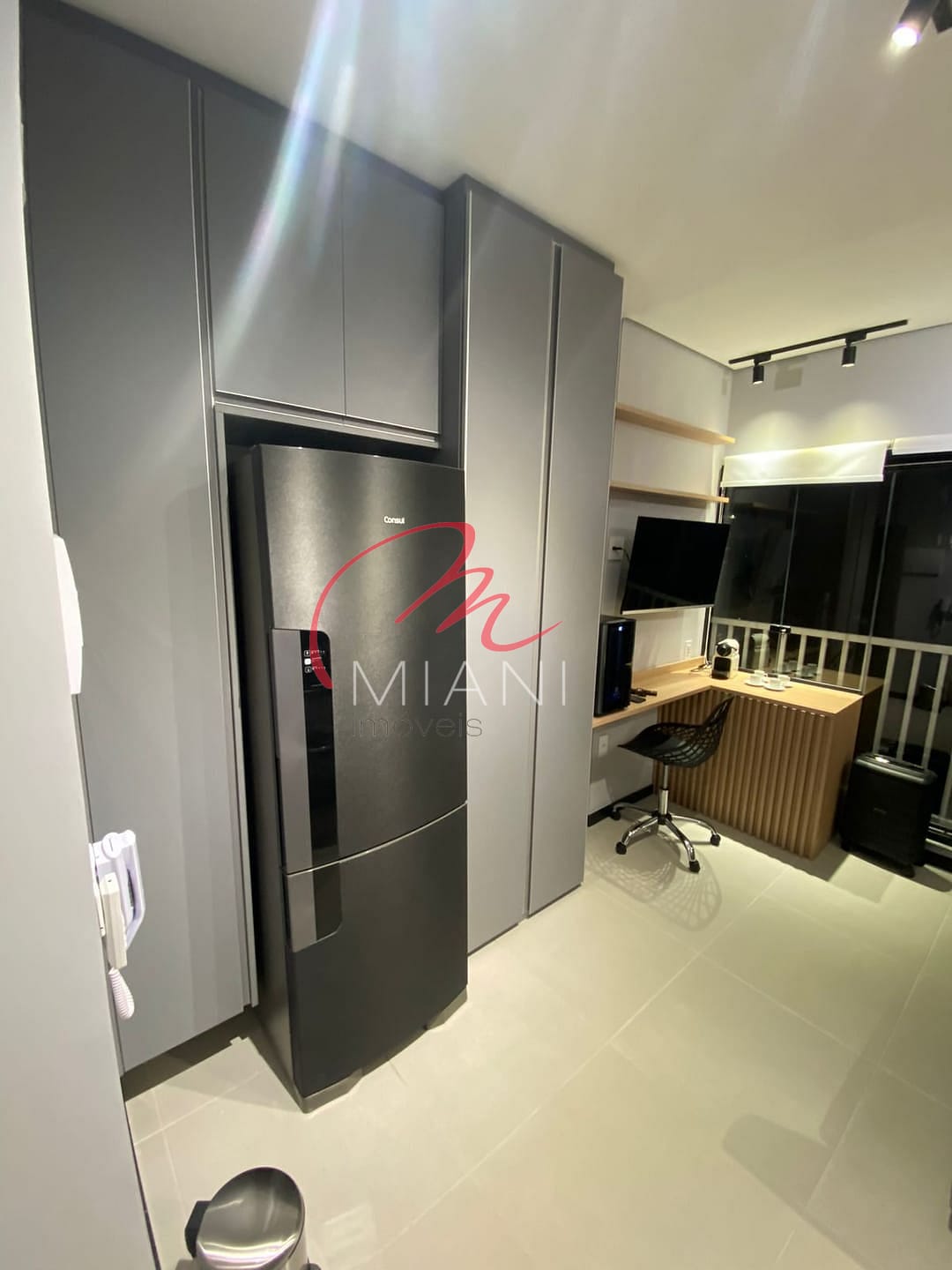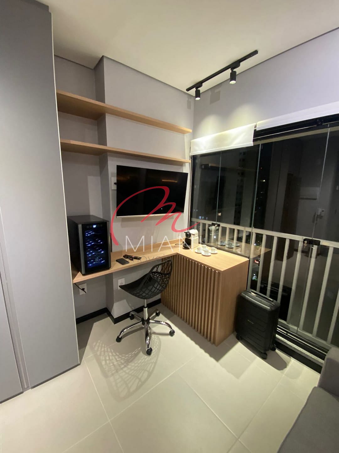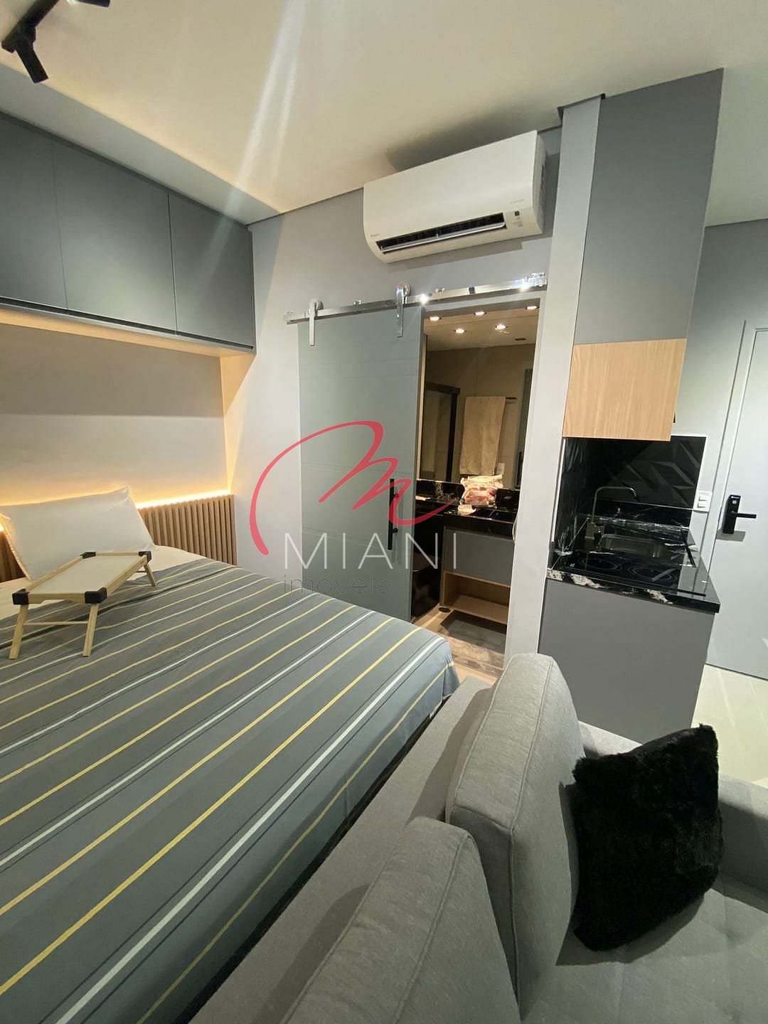 A unidade possui cozinha com armários planejados, além de ar-condicionado, lavanderia e porcelanato em todo o piso.