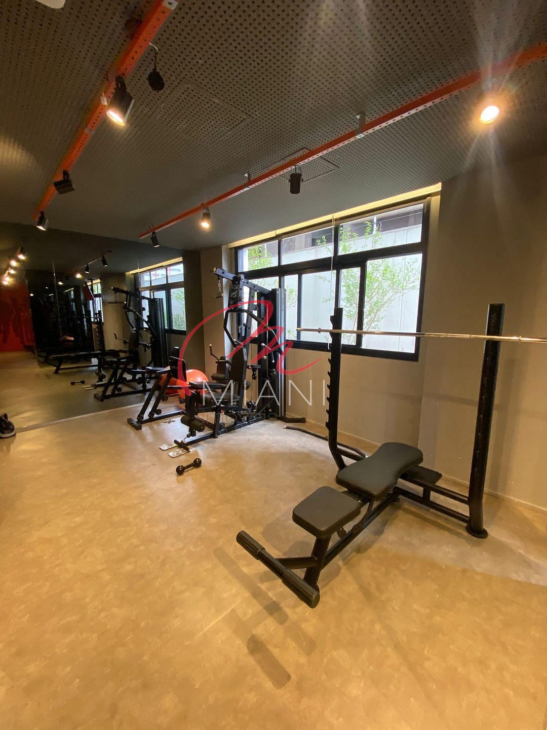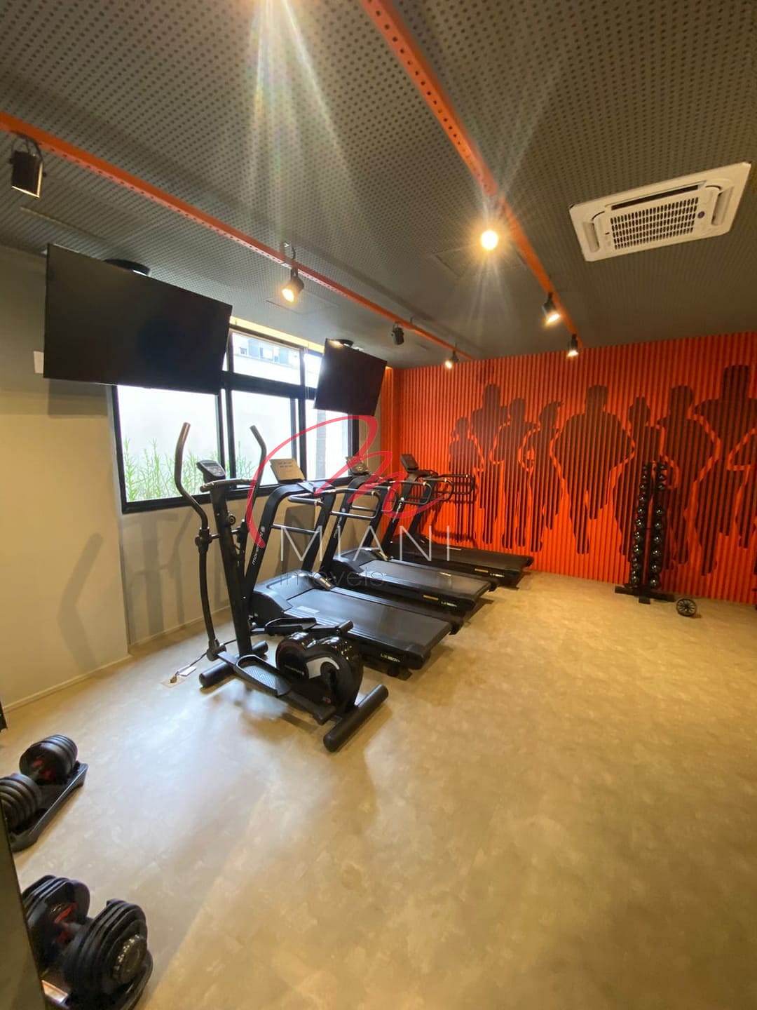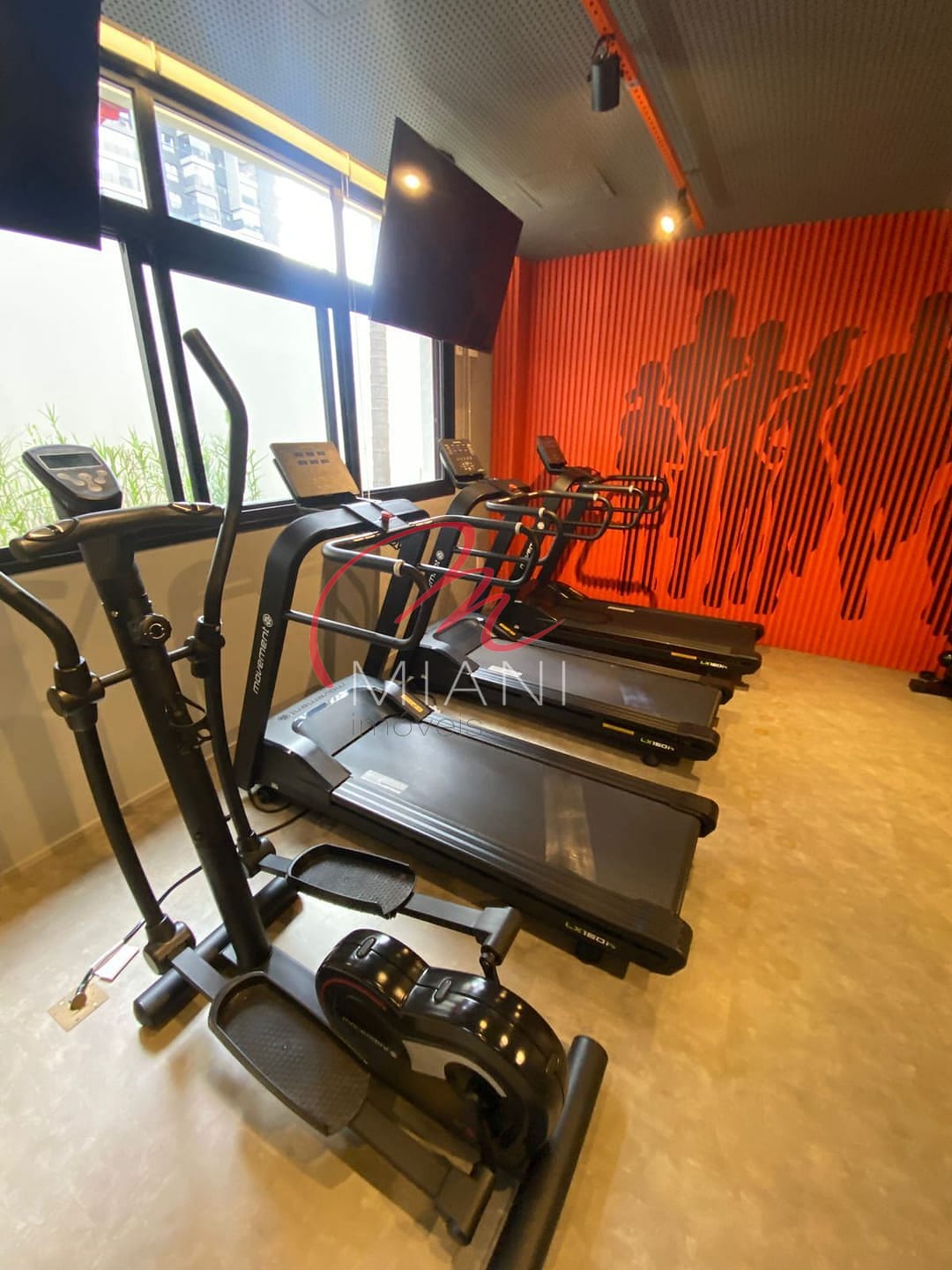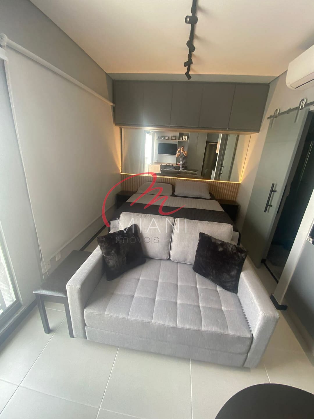 A unidade possui cozinha com armários planejados, além de ar-condicionado, lavanderia e porcelanato em todo o piso.