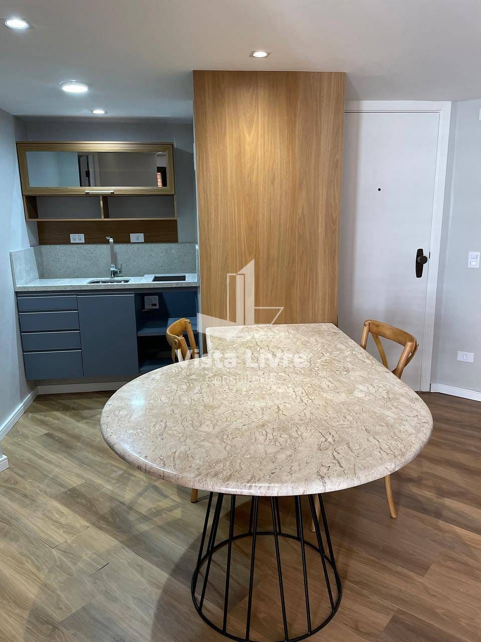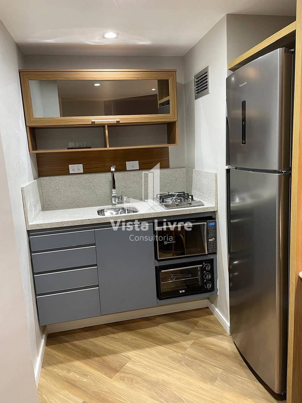 A unidade apresenta uma planta bem distribuída, com amplas janelas que garantem ótima iluminação natural. O ambiente único integra sala de estar, cozinha e dormitório em um espaço fluido e aconchegante. A suíte conta com armários planejados e um banheiro completo, proporcionando conforto e praticidade no dia a dia.