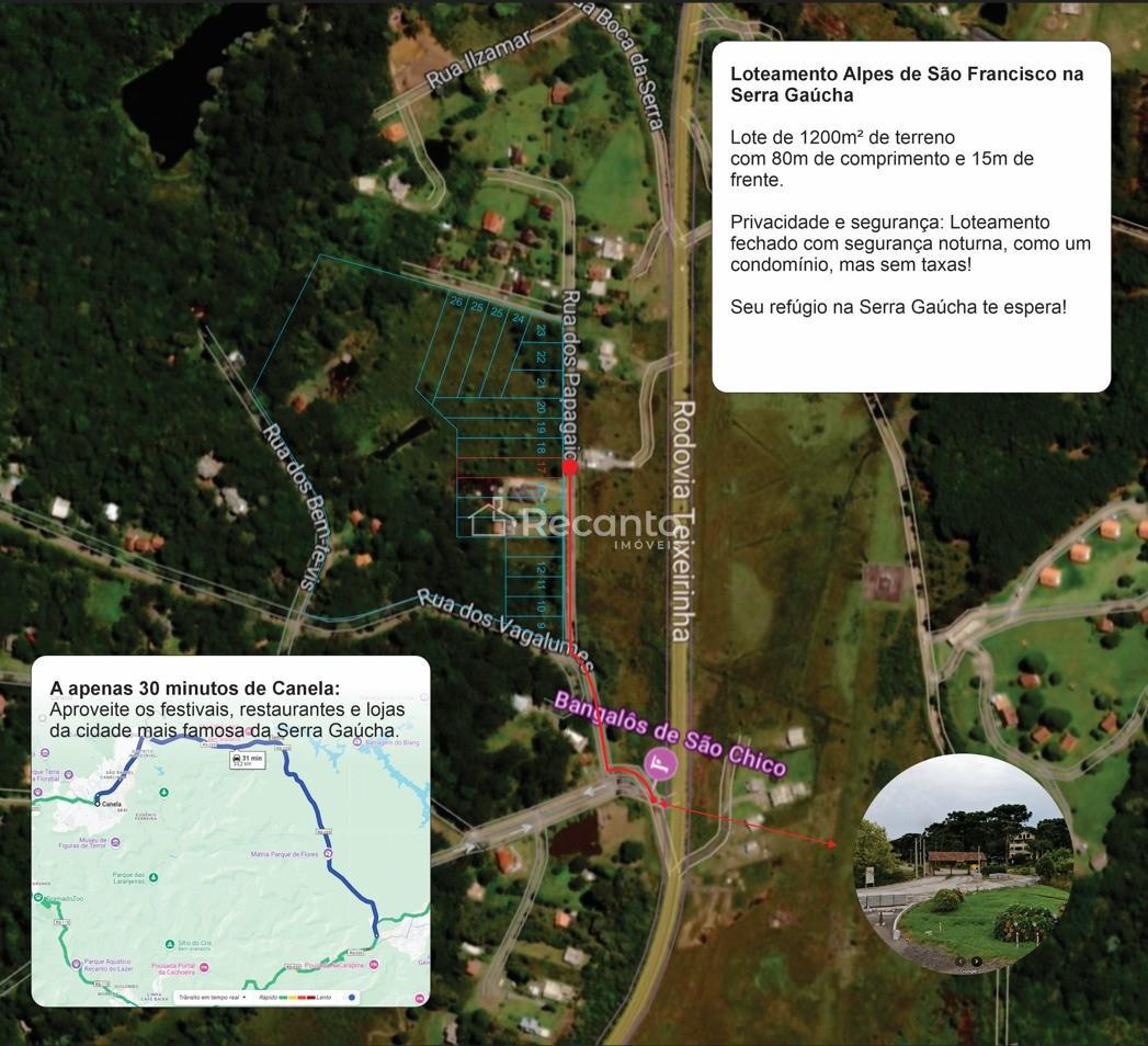 SEU REFÚGIO NA SERRA GAÚCHA ? LOTE EXCLUSIVO EM MEIO À NATUREZA: Já imaginou acordar com o som dos pássaros e respirar o ar puro da Serra? Este lote de 1200m², localizado no Bairro Alpes, a apenas 30 minutos de Gramado, é perfeito para quem busca tranquilidade, segurança e contato com a natureza.