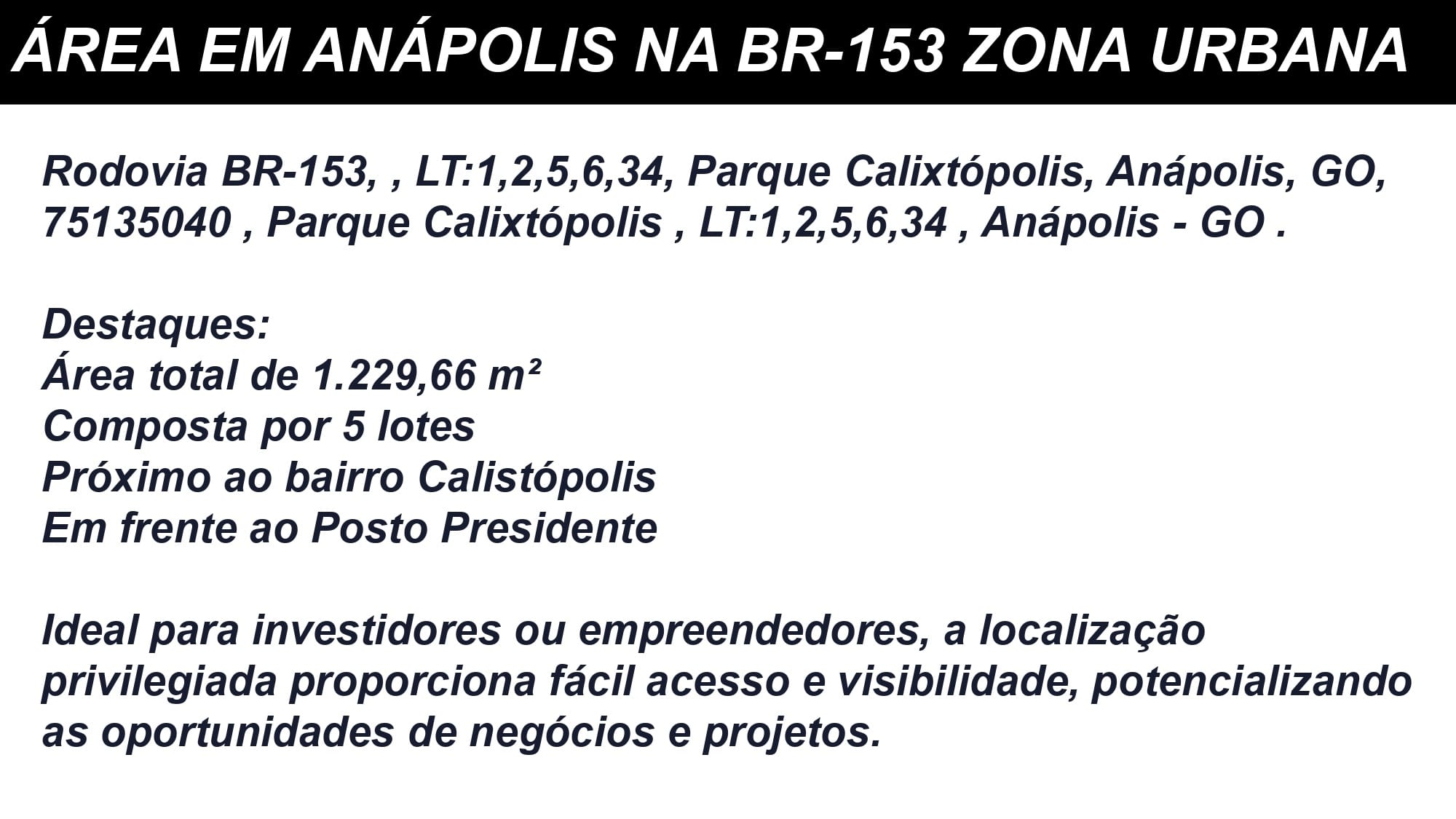 Aproveite esta oportunidade única e agende uma visita para conhecer mais sobre esta área promissora em Anápolis!