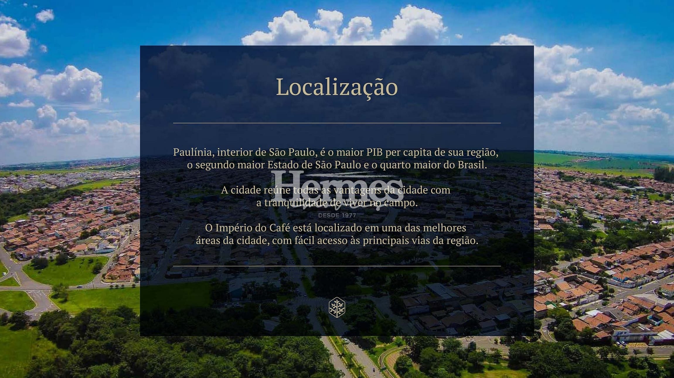 Paulínia, interior de São Paulo, é o maior PIB per capita de sua região, o segundo maior Estado de São Paulo e o quarto maior do Brasil. A cidade reúne todas as vantagens da cidade com a tranquilidade de viver no campo. O Império do Café está localizado em uma das melhores áreas da cidade, com fácil acesso às principais vias da região.