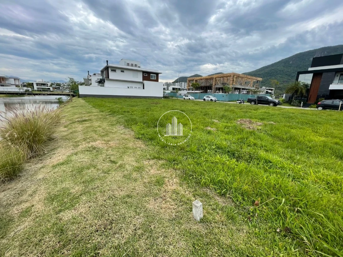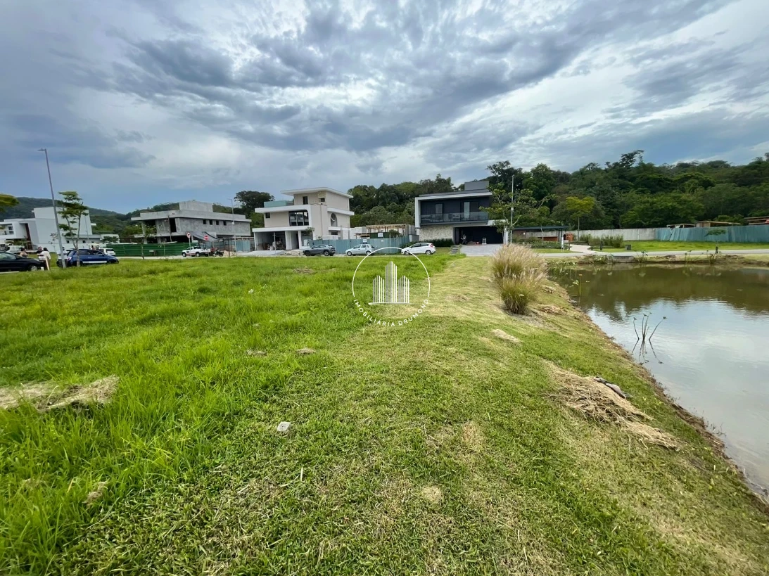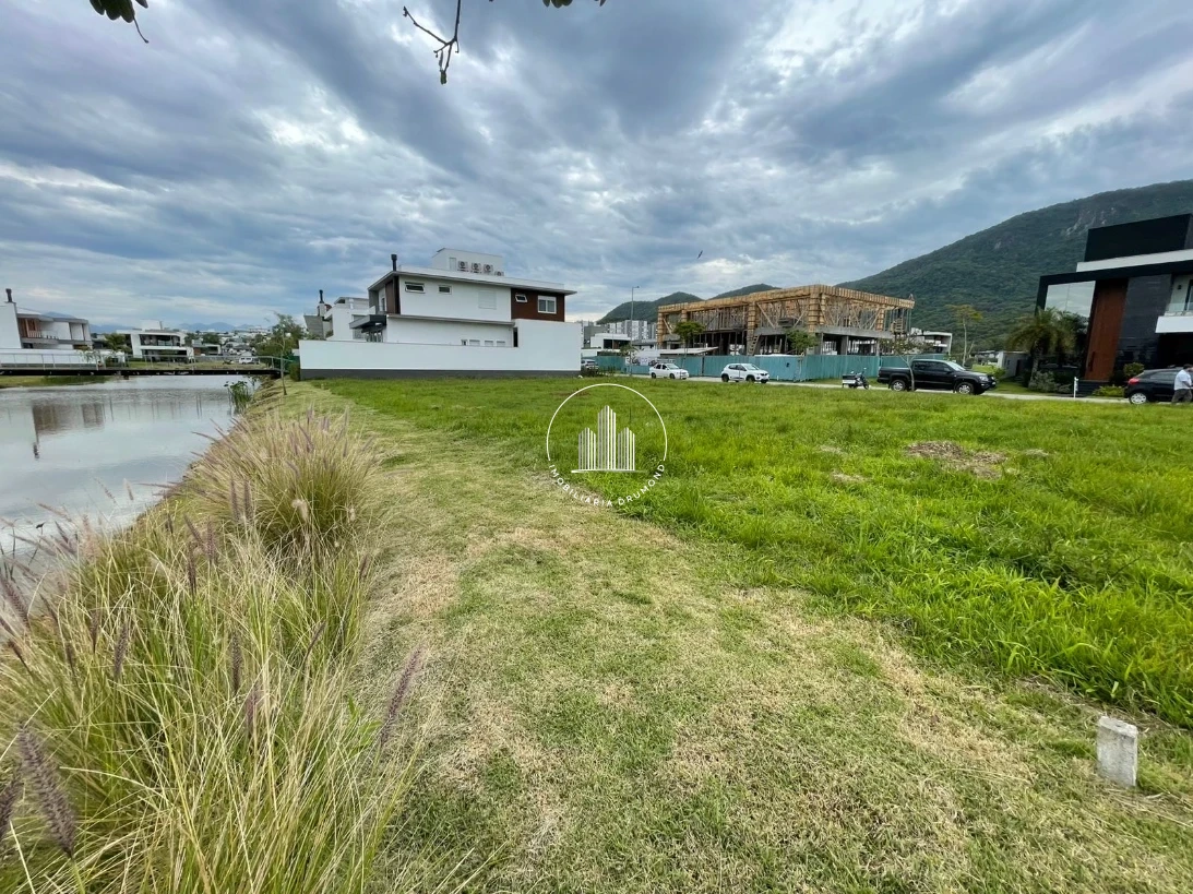 Terreno 400m² em Pedra Branca, Palhoça no Condomínio Reserva da Pedra com fundo para lago. A propriedade possui topografia plana facilitando a construção, está devidamente averbada com escritura pública e permite financiamento bancário. O terreno oferece vista privilegiada e localização estratégica dentro do condomínio fechado.
